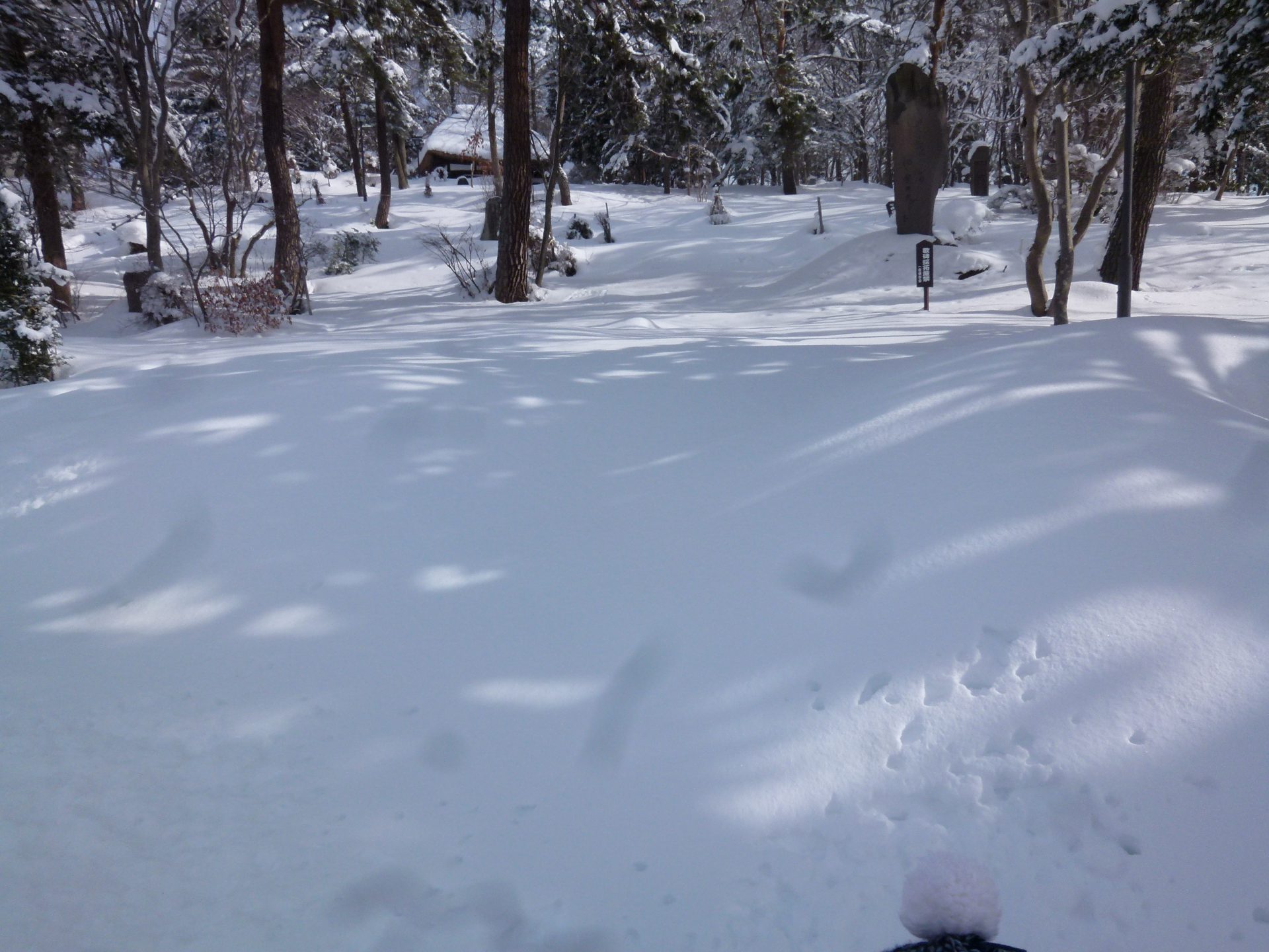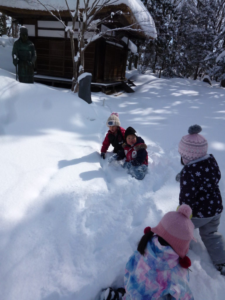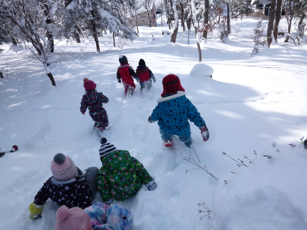 小丸山公園に到着。まだ誰も踏み入れていない雪の上を子ども達は全力前進。信濃町の子どもは逞しいです。どんなに雪が積もっていようがお構いなし!!どんどんと歩き進めていきます。