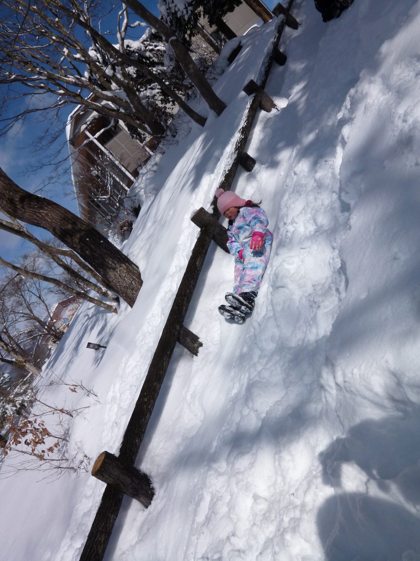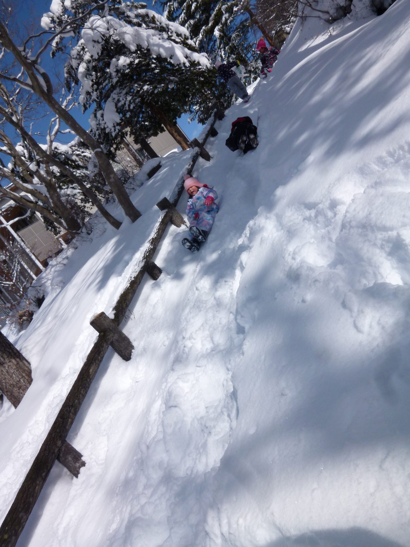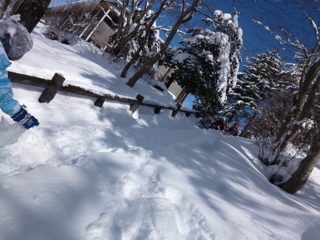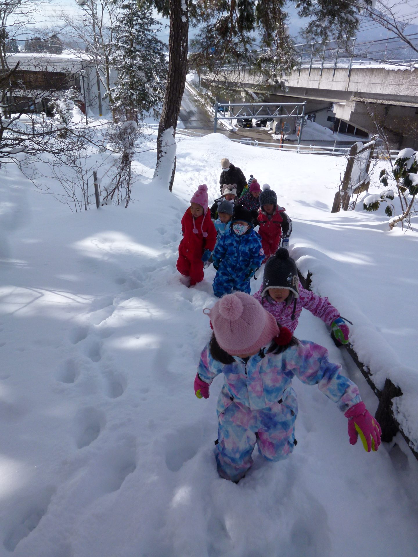 雪が積もる前はここには階段があったのですが、今では雪で隠れて見えません。大人が登ると”はぁーはぁー”と息が上がってしまい立ち止まりながら行く雪の坂道を子ども達はすいすいと登って行ってしまいます。(年のせい?)
