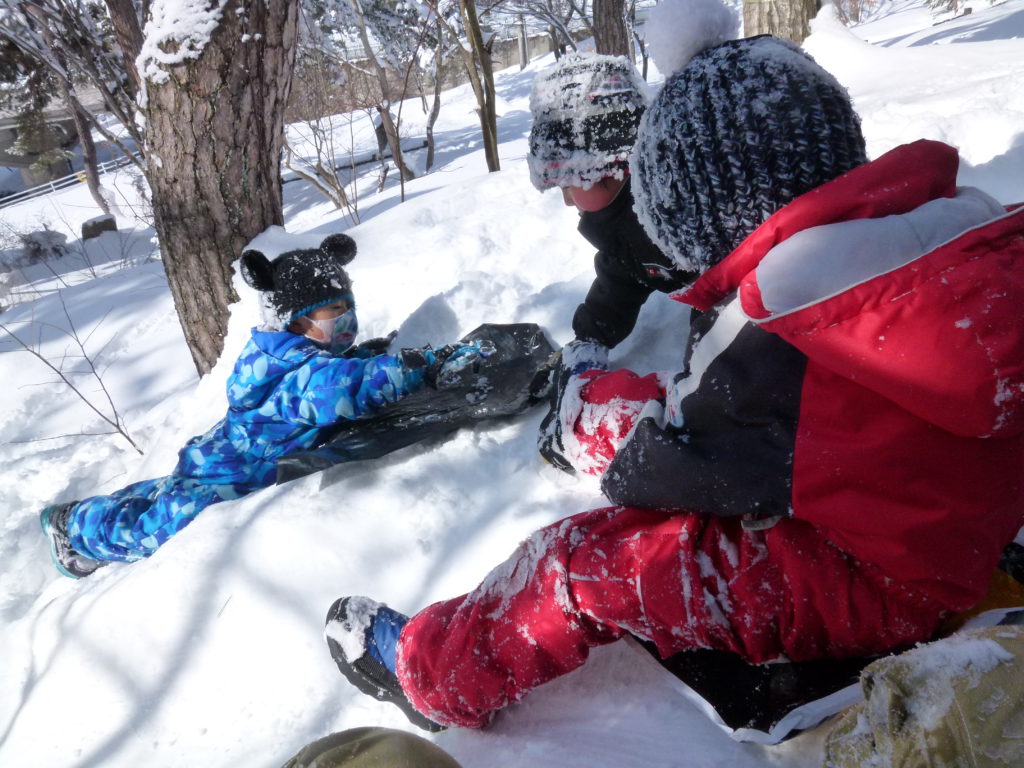 滑る前にビニール袋に座る時のお尻の位置や足の位置など、色々試しながら滑りベストポジションを見つけて楽しむ姿が見られました。