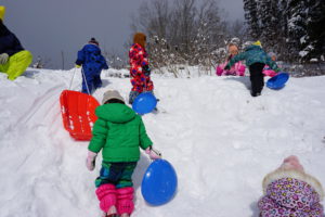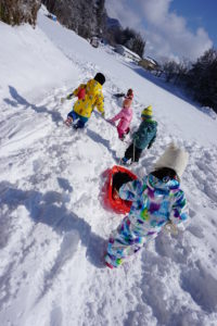 だんだん慣れてくると、そりを持って登り出す子どもたち。