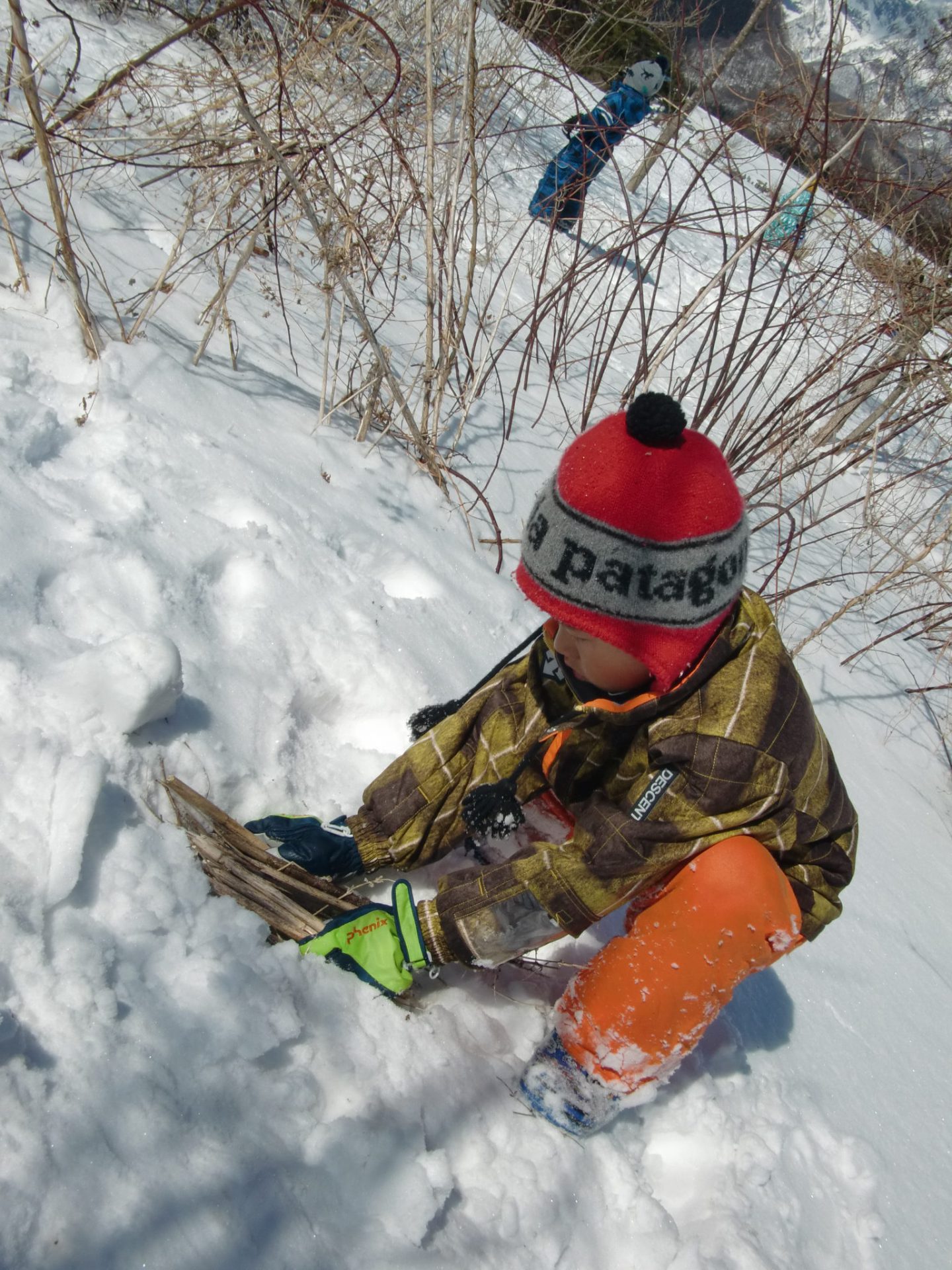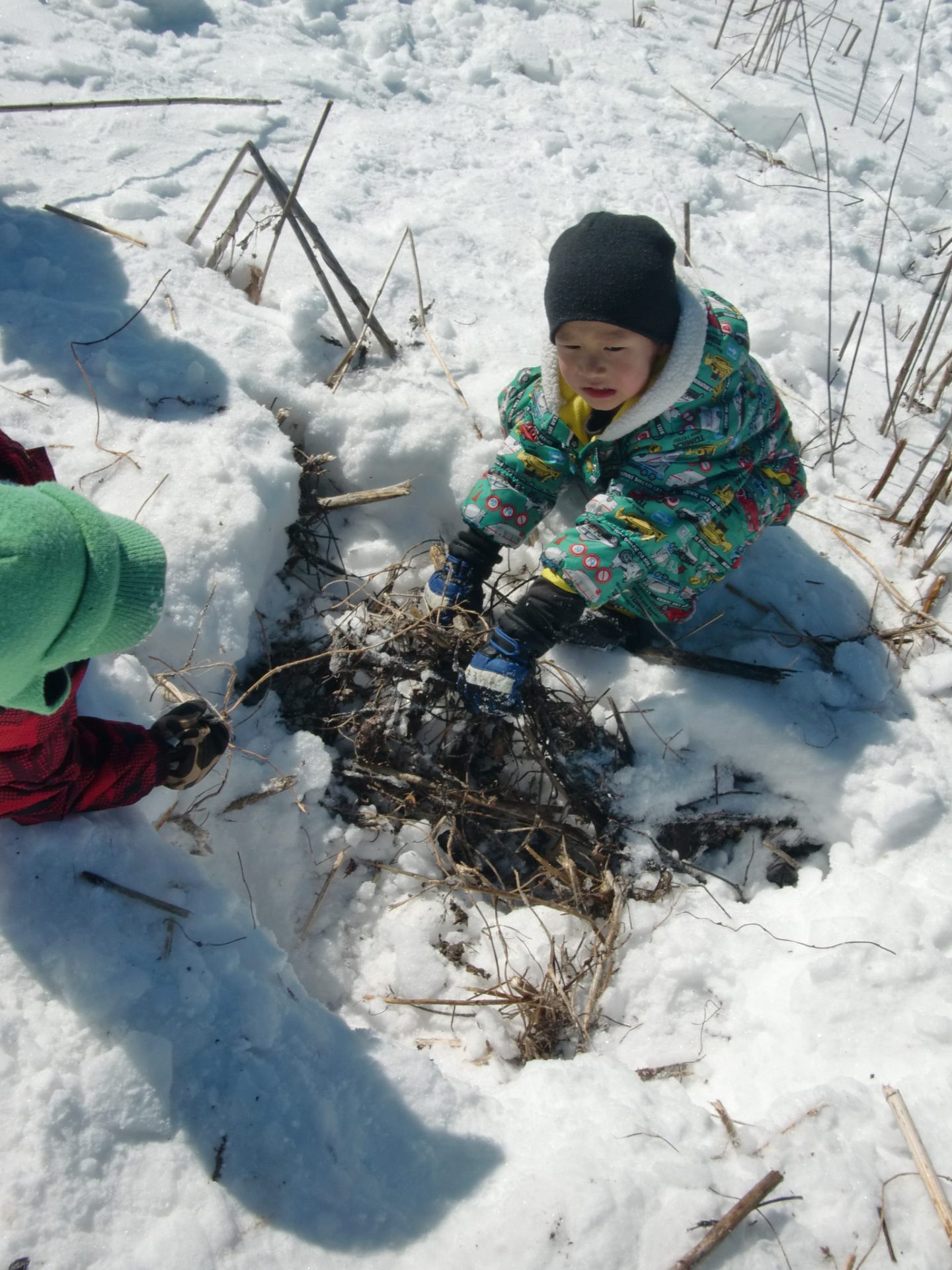 そして、寒いからたき火で温まるように、薪を集めてたき火ごっこが始まりました!
