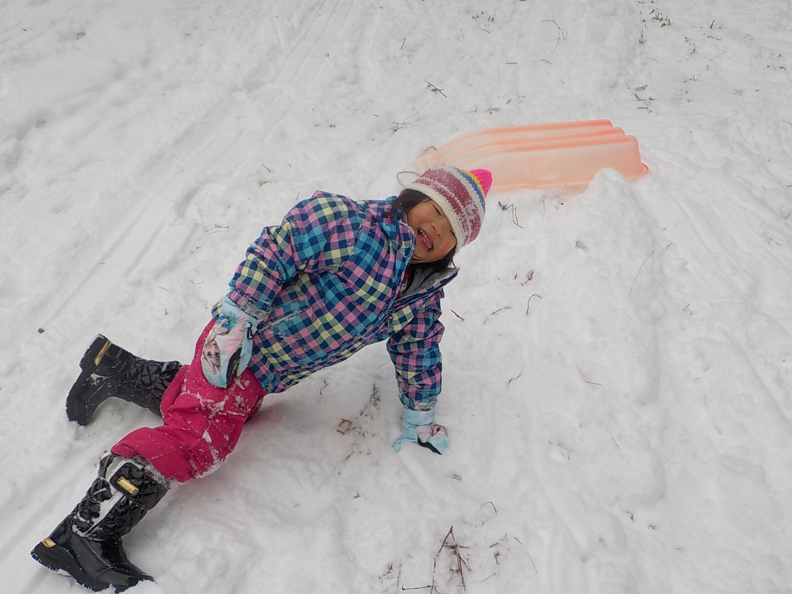 転んじゃった~!でも、雪がフカフカだから平気!
