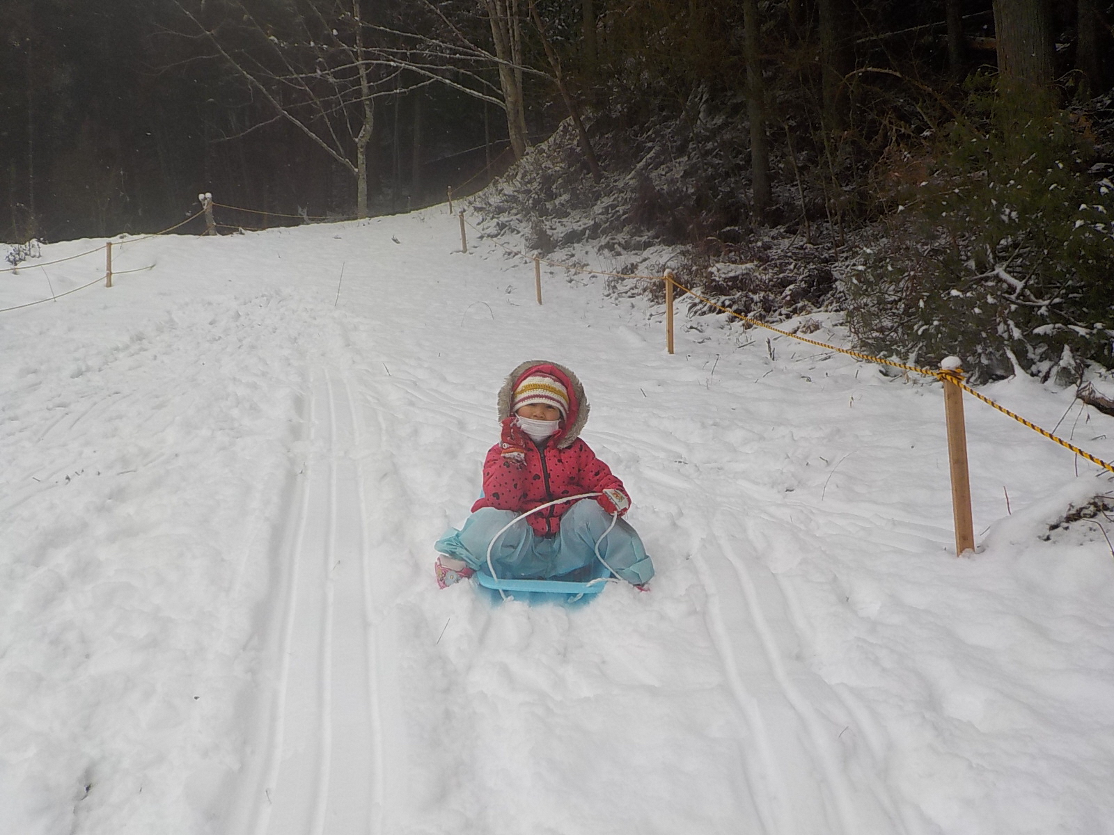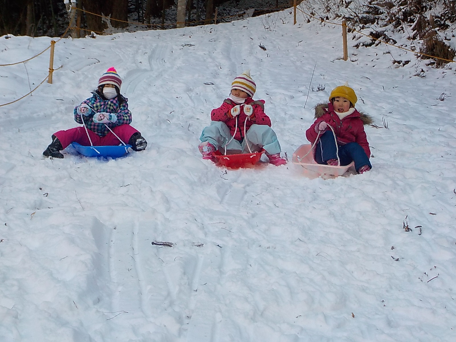 「あぶないから、足はそりの上に置いてすべったほうがいいよ」