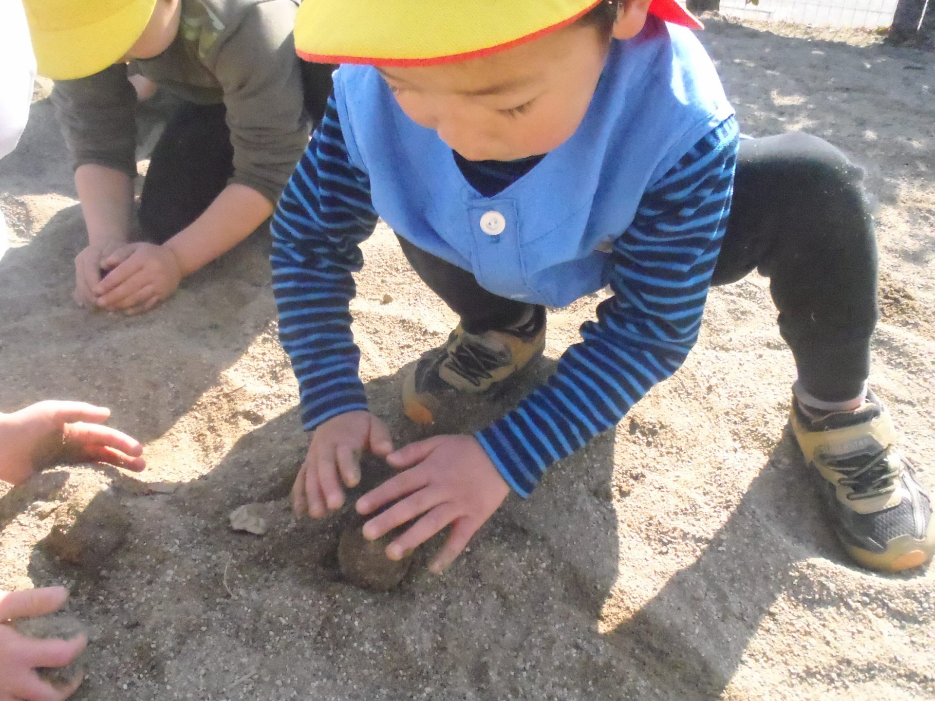 冬場はやっていなかったおだんご作りが始まりました。砂の温かさを素手で感じていて、子どもは体全身で春の訪れを感じているんだなぁと思いました。