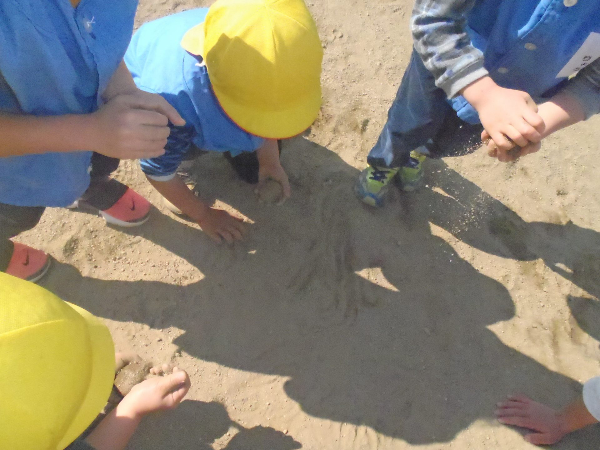 「白いさらさらした砂を探すといいよ」と保育士の声にあっちでもないこっちでもないと園庭を探し回りついにお山の所にいい砂をみつけました!