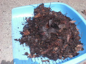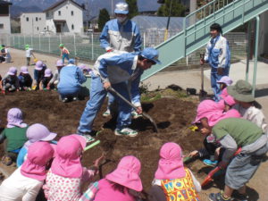 春先に、隣接の農業高校のお兄さんお姉さんが、小さな畑に立派な「腐葉土」を持ってきてくれて入れてくれました。子ども達は初めて腐葉土を目にしました。
