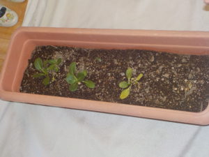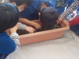 腐葉土を入れた土にまいた青梗菜をもってきてくれて子ども達は自由にさわったり、匂いををかいだりしました。