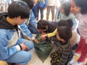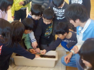 新しい腐葉土を持参してその働きについて、紙芝居や実物を持ってきて教えてくれました。