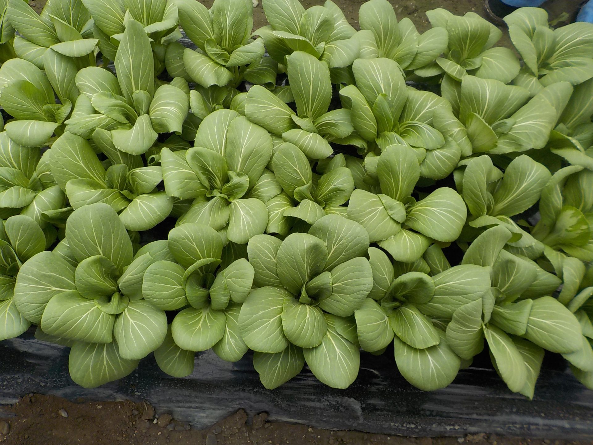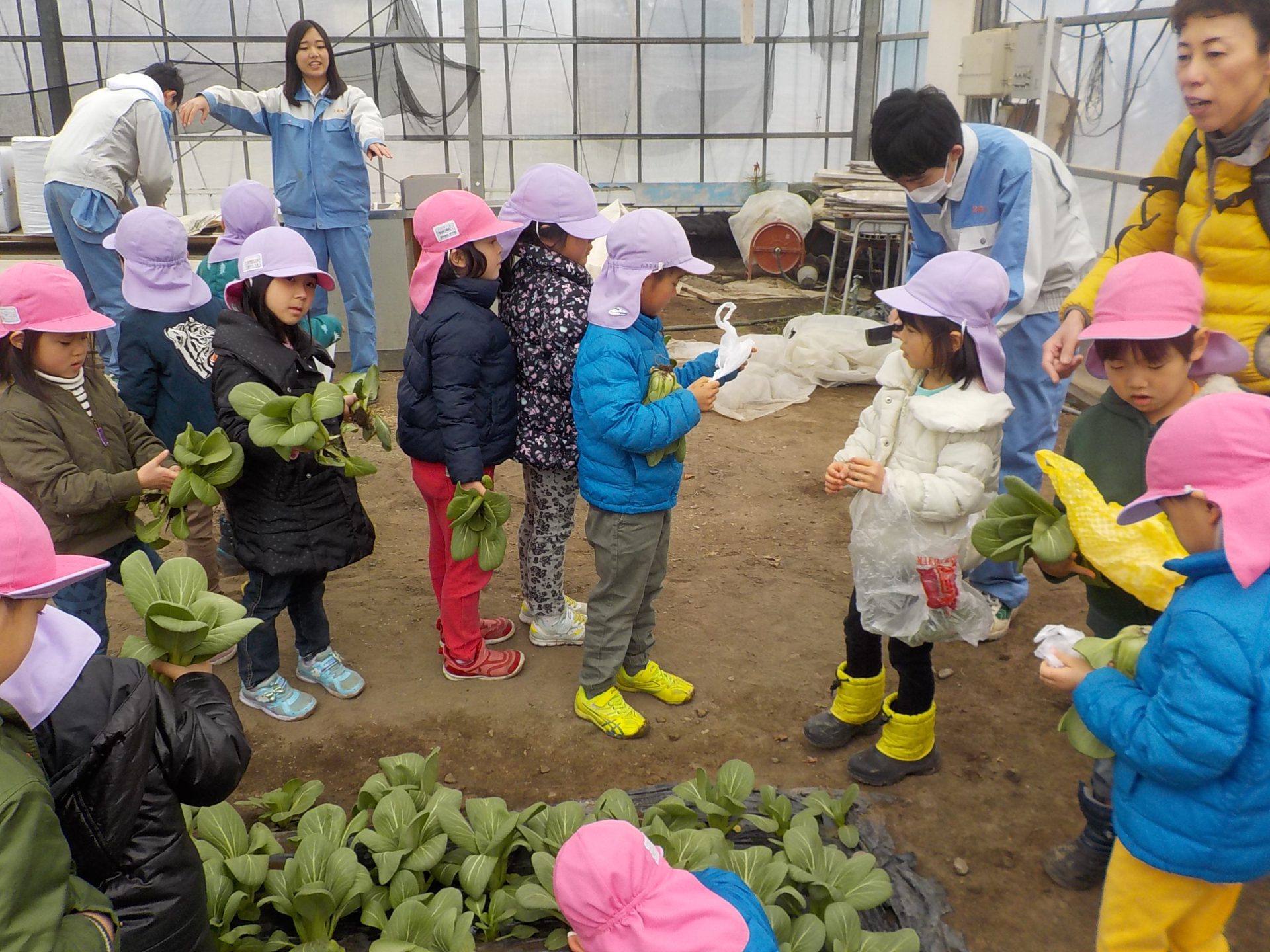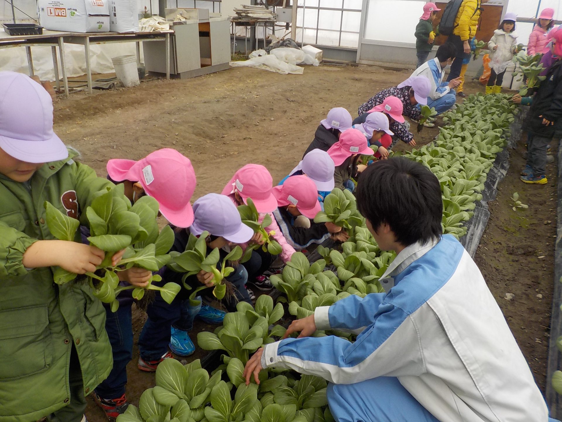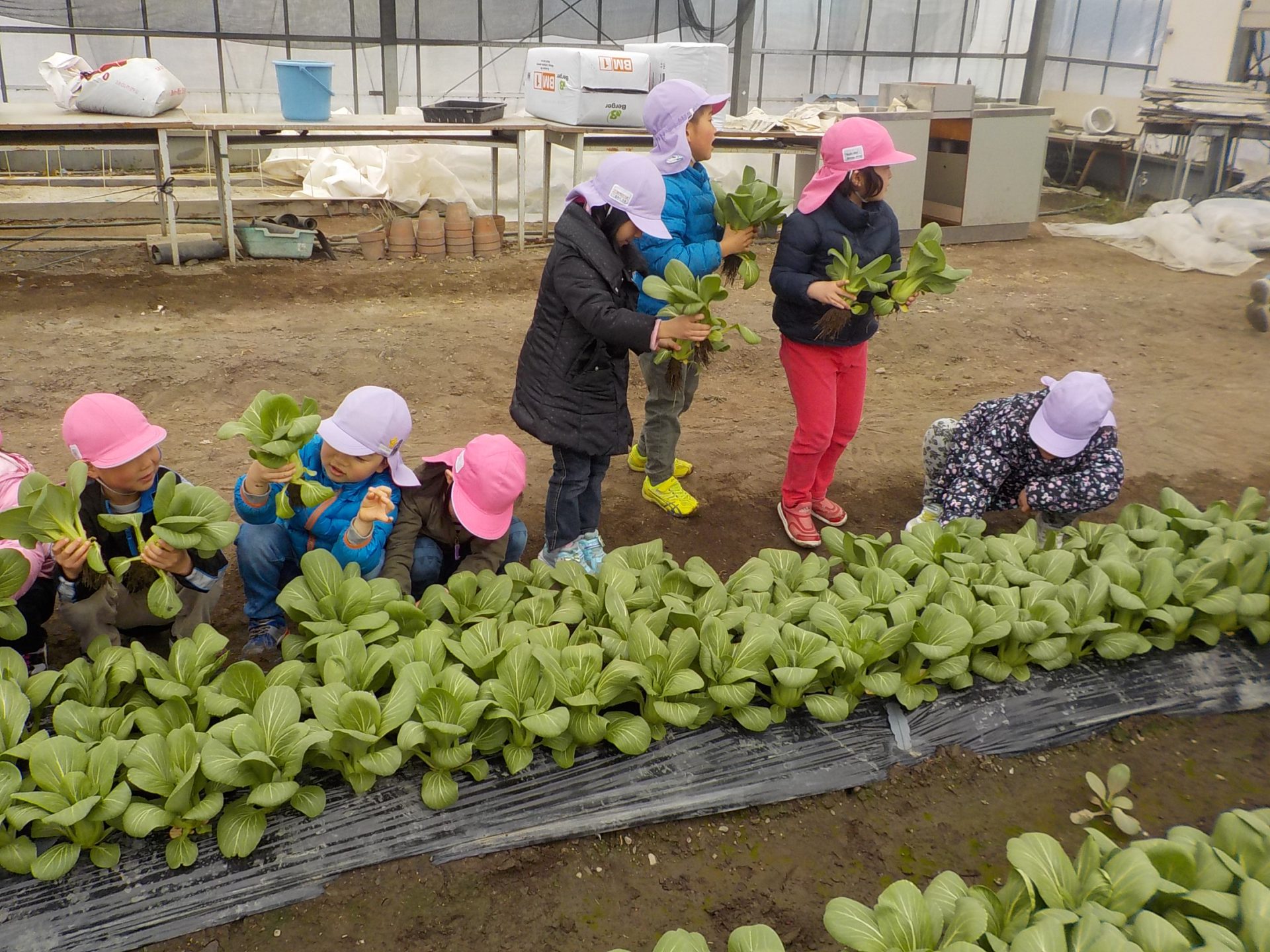 ハウスの中の大きく育った青梗菜を収穫させてもらいました。