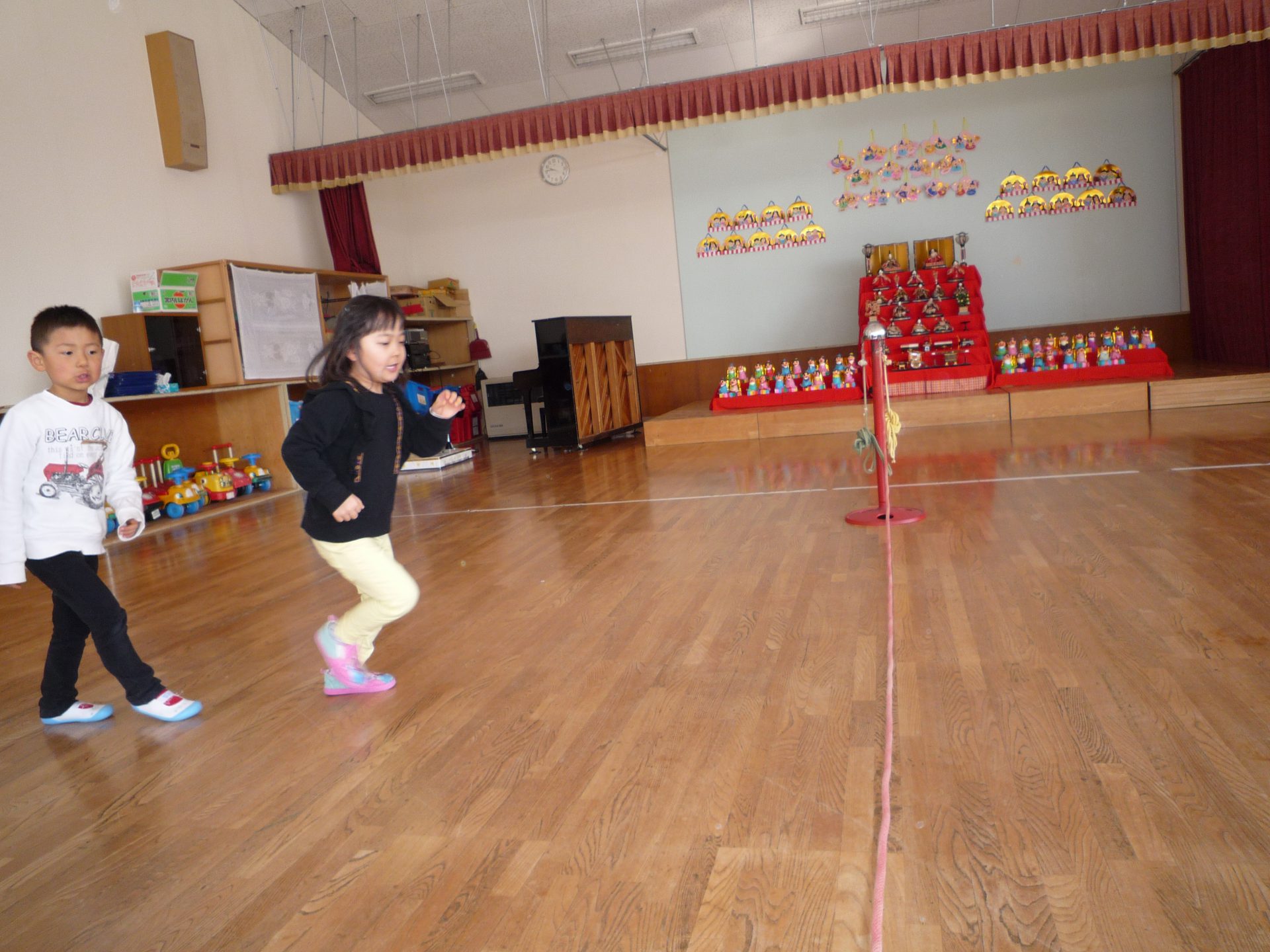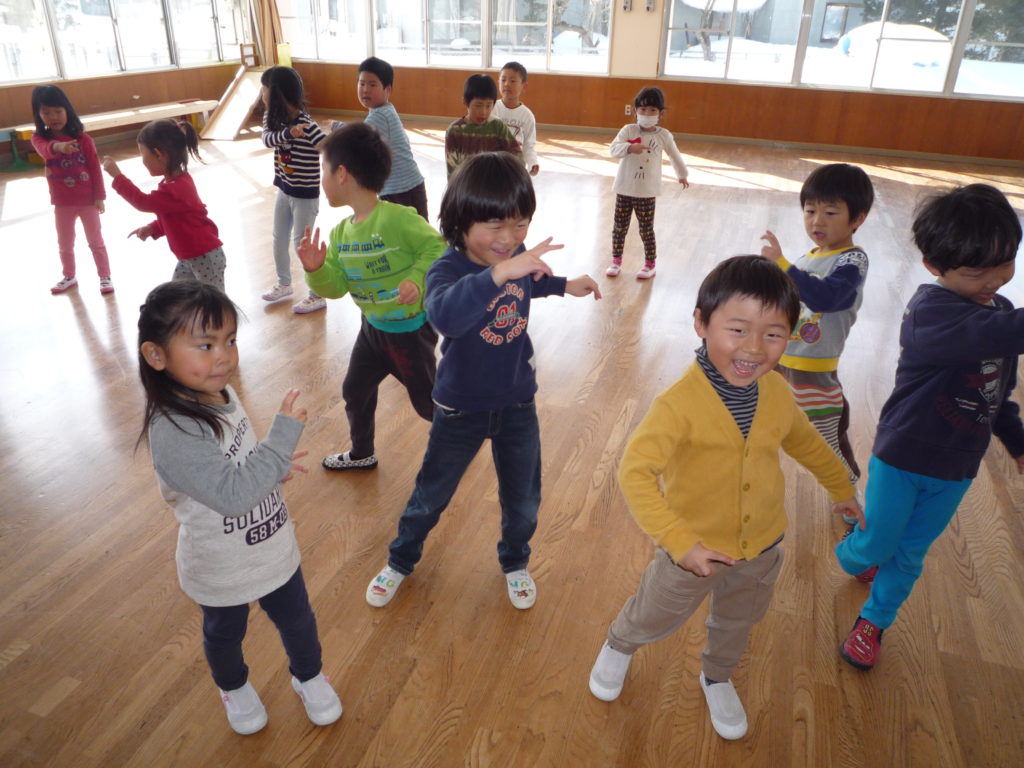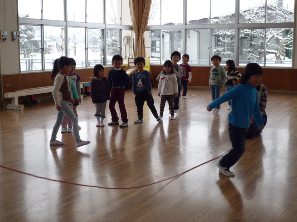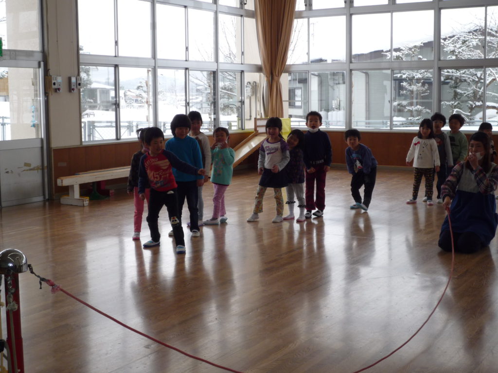毎日、雪遊びを楽しむ子ども達ですが遊び方によってはあまり体を動かしていない姿も見られたので継続的に体を動かしてほしいと思い大縄跳びを始めました。