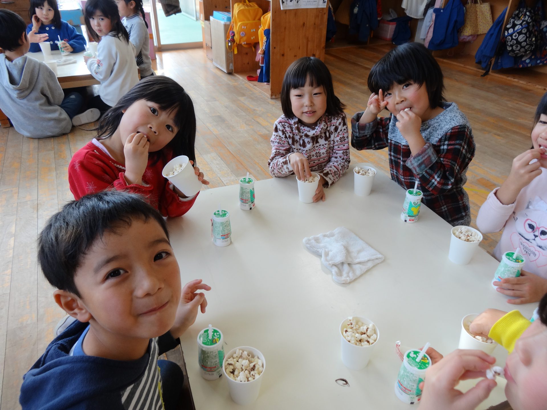 栽培、収穫から調理まで関わり、子ども達の好きなおやつであるポップコーンを身近に感じ、他の学年にもごちそうをして、おいしく食べながら達成感をもてた活動になりました。