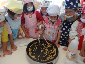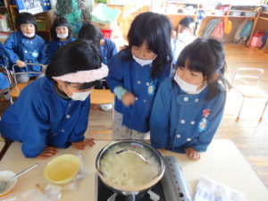 「はじめた!」「良い匂い!!」ドキドキのぞく子ども達。