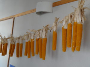 部屋のすぐ前に吊るしたトウモロコシを毎日見守る子ども達。