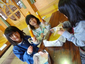 「やっと粒とりだ!」「固いね」「アレ?難しい…」「順番に列でとるんだよ!」段々上手になってきました。