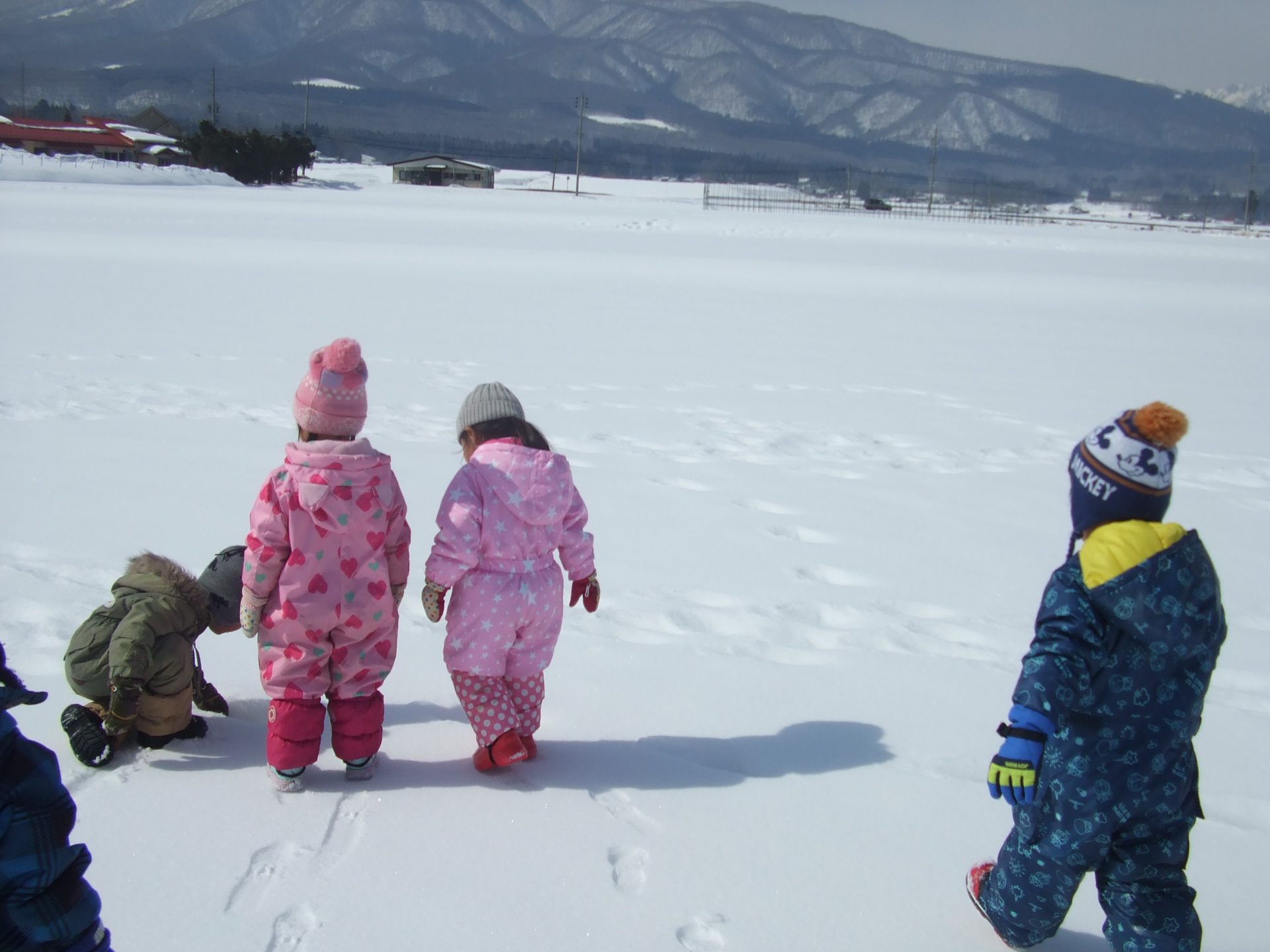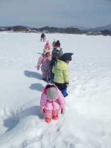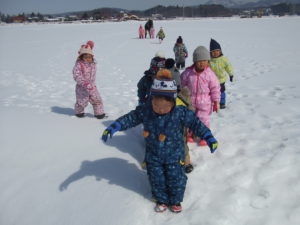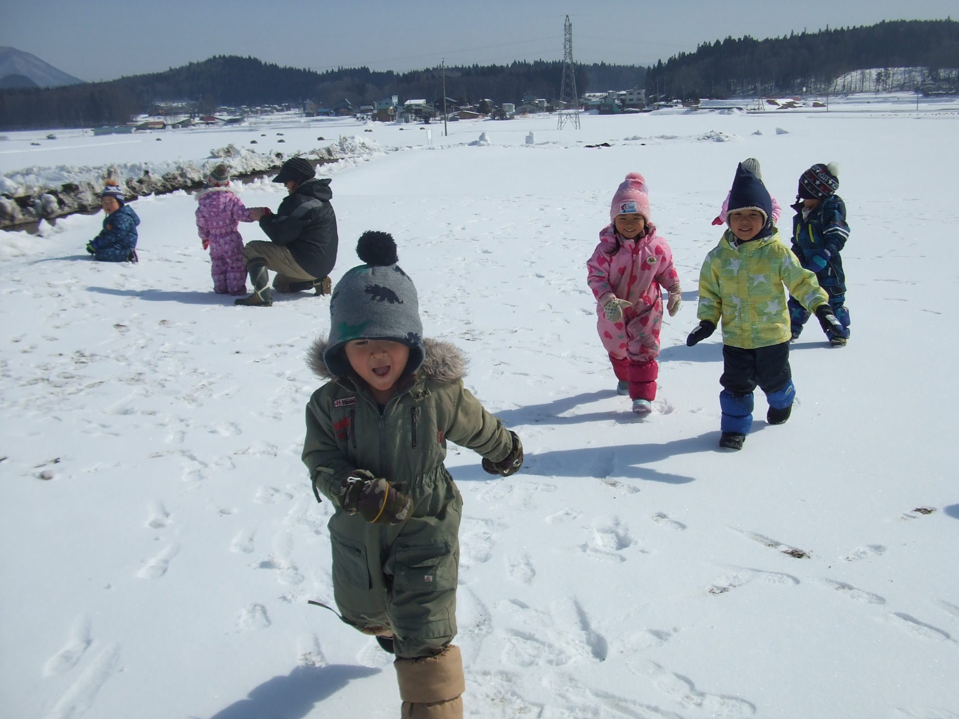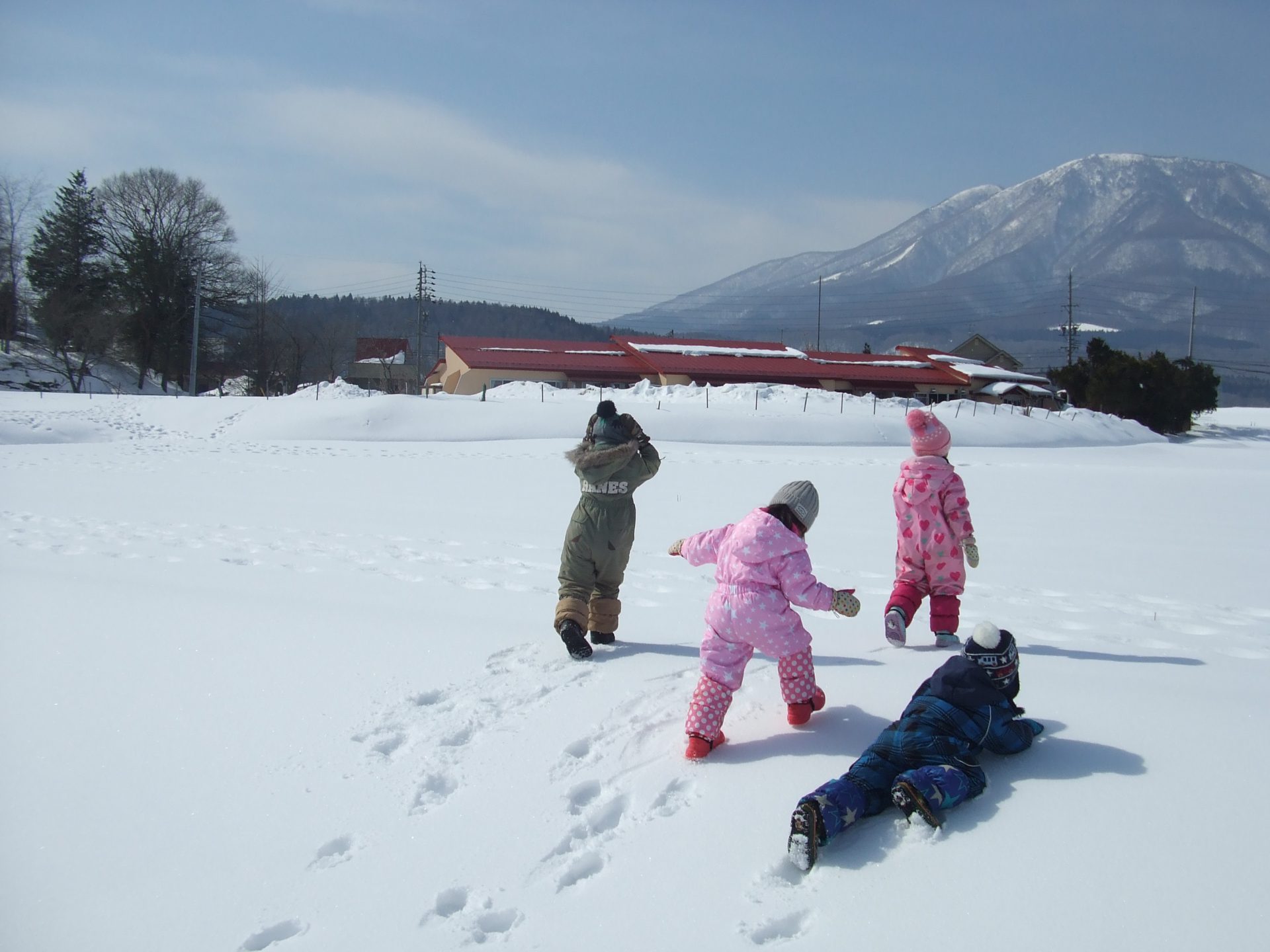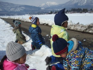 富士里保育園は雪が積もると辺り一面が銀世界になり、どこまでも雪道が続く開放的な場所が身近にあります。そんな素敵な環境の中で子ども達がのびのびと遊べることに感謝しながら、子ども達が信濃町の雪遊びを楽しいと思える瞬間をたくさん経験できるように活動して行きたいと思いました。また、今回の事例の中で、地域の方との関わりを持つ大切さや雪遊びの中でも多くの学びがあることを改めて実感することができました。