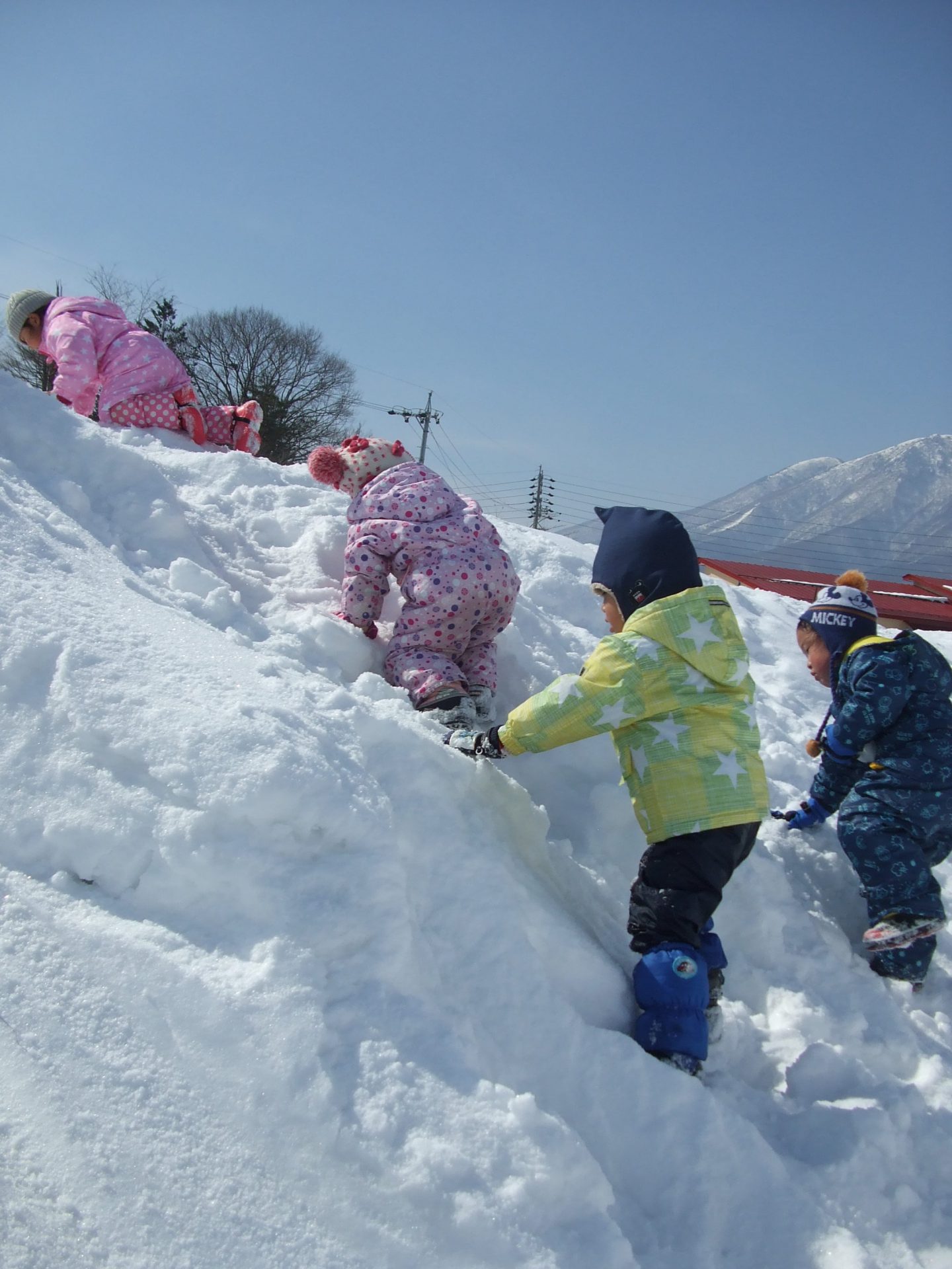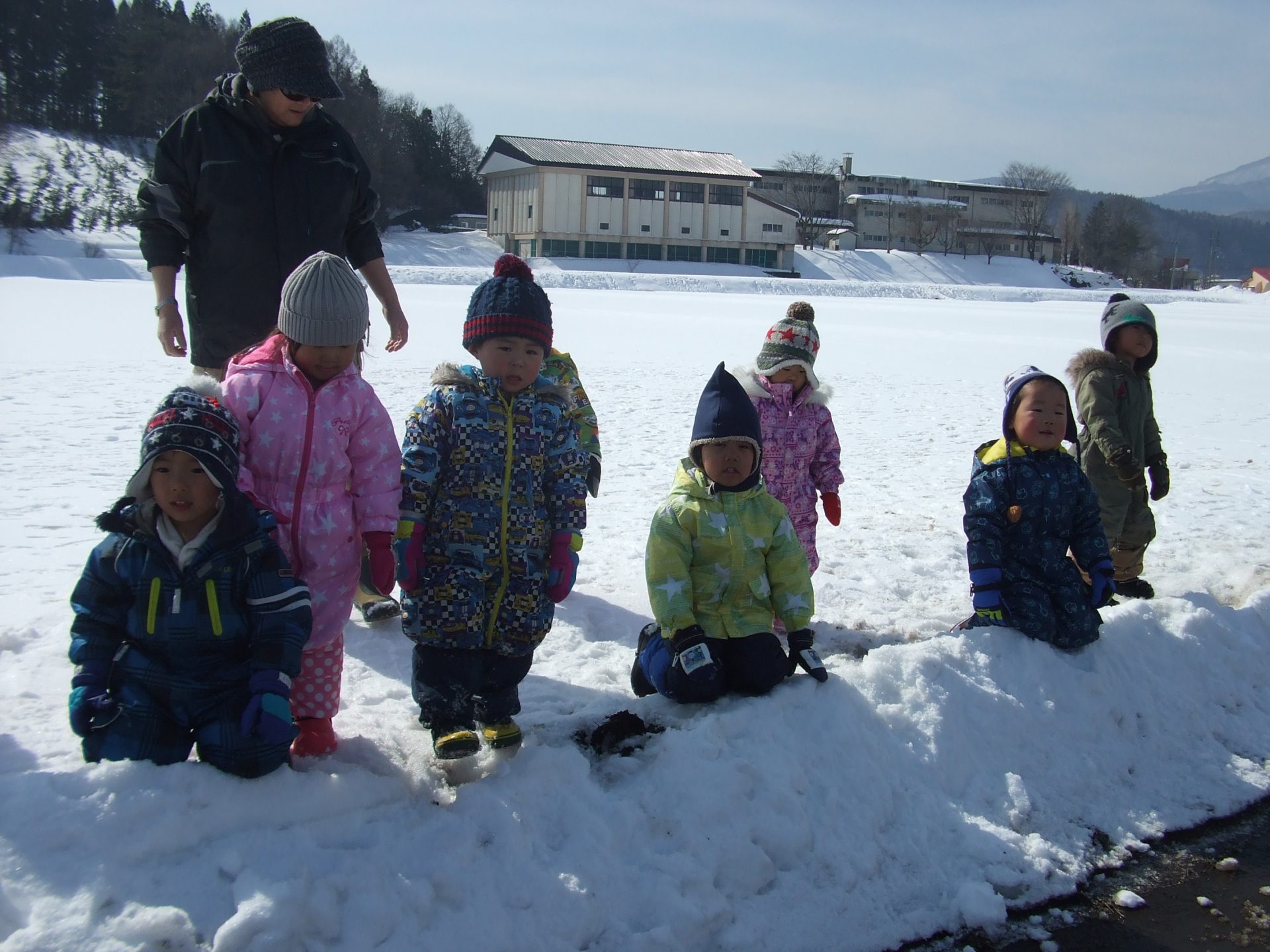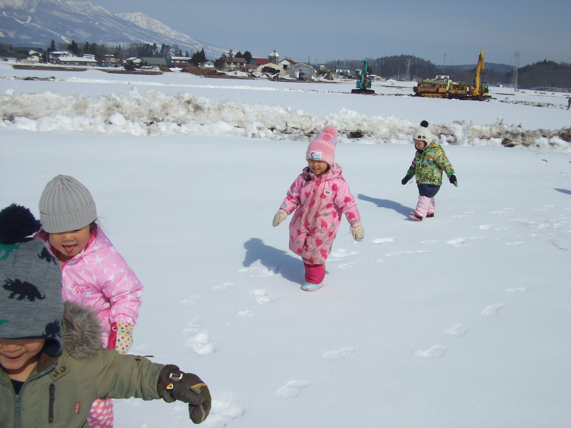 富士里保育園は雪が積もると辺り一面が銀世界になり、どこまでも雪道が続く開放的な場所が身近にあります。そんな素敵な環境の中で子ども達がのびのびと遊べることに感謝しながら、子ども達が信濃町の雪遊びを楽しいと思える瞬間をたくさん経験できるように活動して行きたいと思いました。また、今回の事例の中で、地域の方との関わりを持つ大切さや雪遊びの中でも多くの学びがあることを改めて実感することができました。