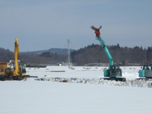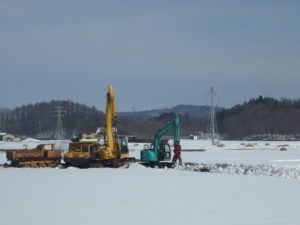 富士里保育園の周りは平地で遠くまでよく見渡すことができます。この日は、保育園からいつも見えていた働く車を見に行ってきました。道路をテクテク歩いていくと、「あっ!」「ショベルカーがいた〜!」と早速嬉しそうな子ども達。