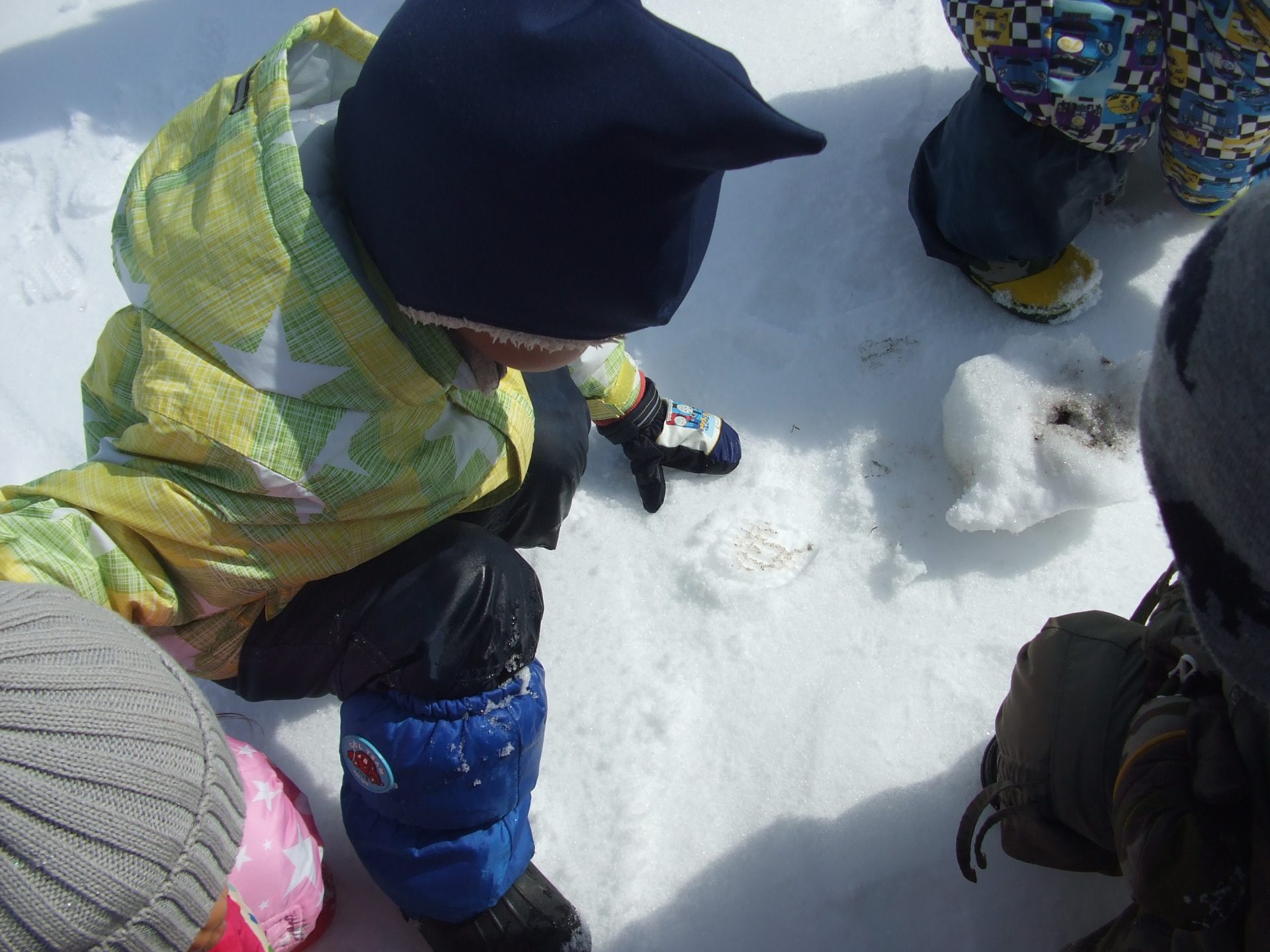 「こっちにもあるよ!」「さっきのより小さいね!」足跡を見つけるたびにちびっこ会議を開き、みんなで何の動物か考えていました。動物も何でも言いわけではなく、「小さいからねずみさんかな?」「大きくなったからワニさんかな?」と大きい小さいを考えながら話し合っていました。
