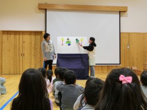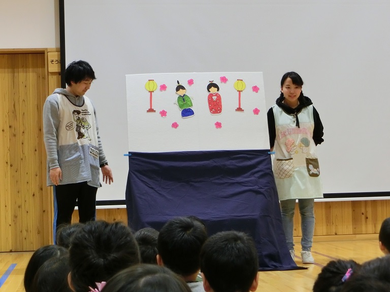 ひな祭りに合わせて「楽しいひなまつり」というパネルシアターを見ていただきました。おひな様が寝坊してしまい色々な動物がおひな様になってくれますがうまくいかず・・・