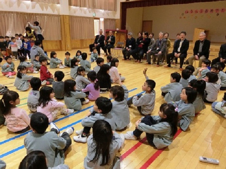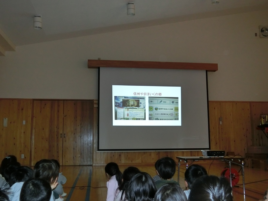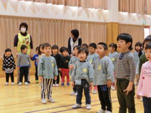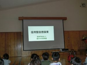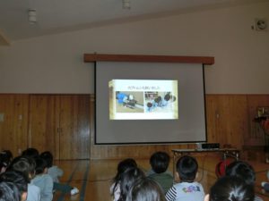 ひな祭り集会の後は、今年度東みのわ保育園が認定された「信州やまほいく」について説明、報告をしました。子どもたちには難しい話でしたが、普段の保育園生活の写真が出てきたので最後までしっかり聞くことができました。
