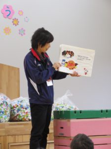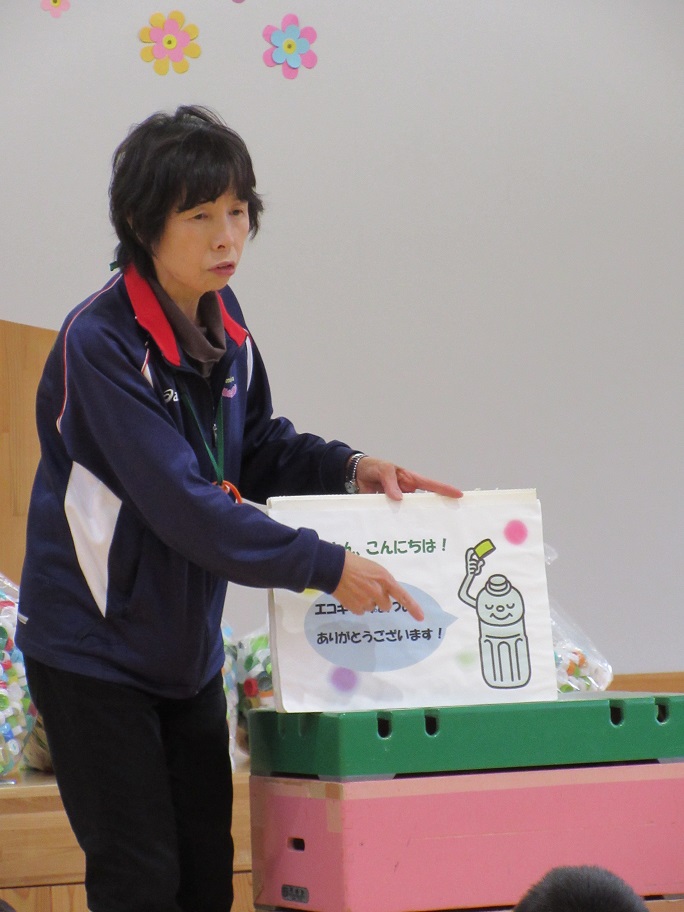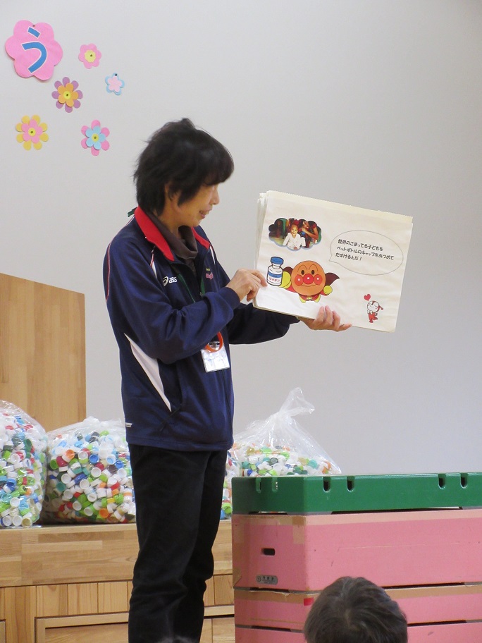 紙芝居のようにエコキャップがどうやってワクチンになっていくのか説明してくれました。