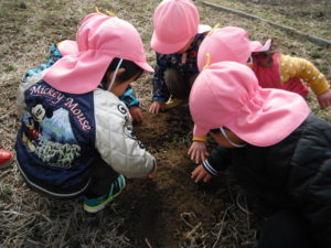 なかよし農園に着くと、ぼこぼこ盛り上がっている小さい土の山をいくつか見つけた子ども達。