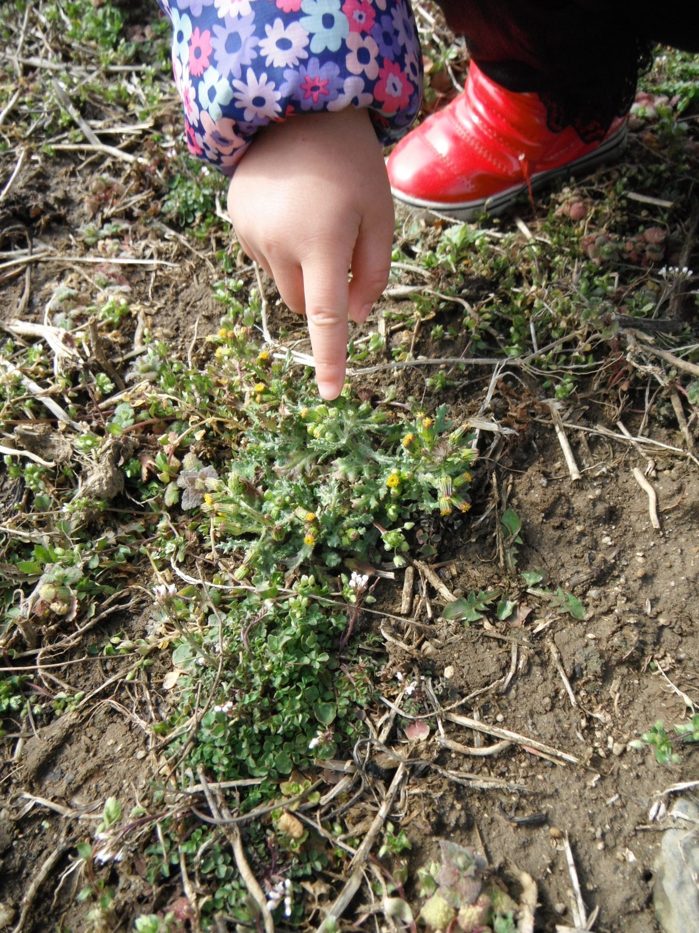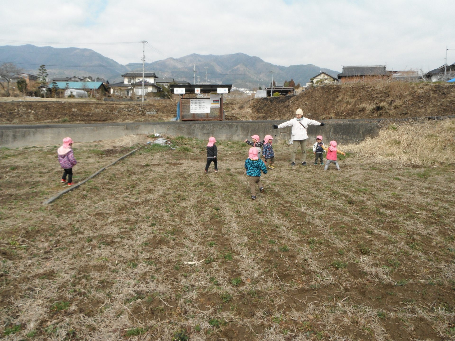 畑には春の草花も顔を出していて、「お花のあかちゃんだ」「ナズナがあるねえ」「ナズナ?」と保育士と言葉のやりとりをしながら、ナズナやホトケノザ、ヒメオドリコソウを見たり摘んだりしています。