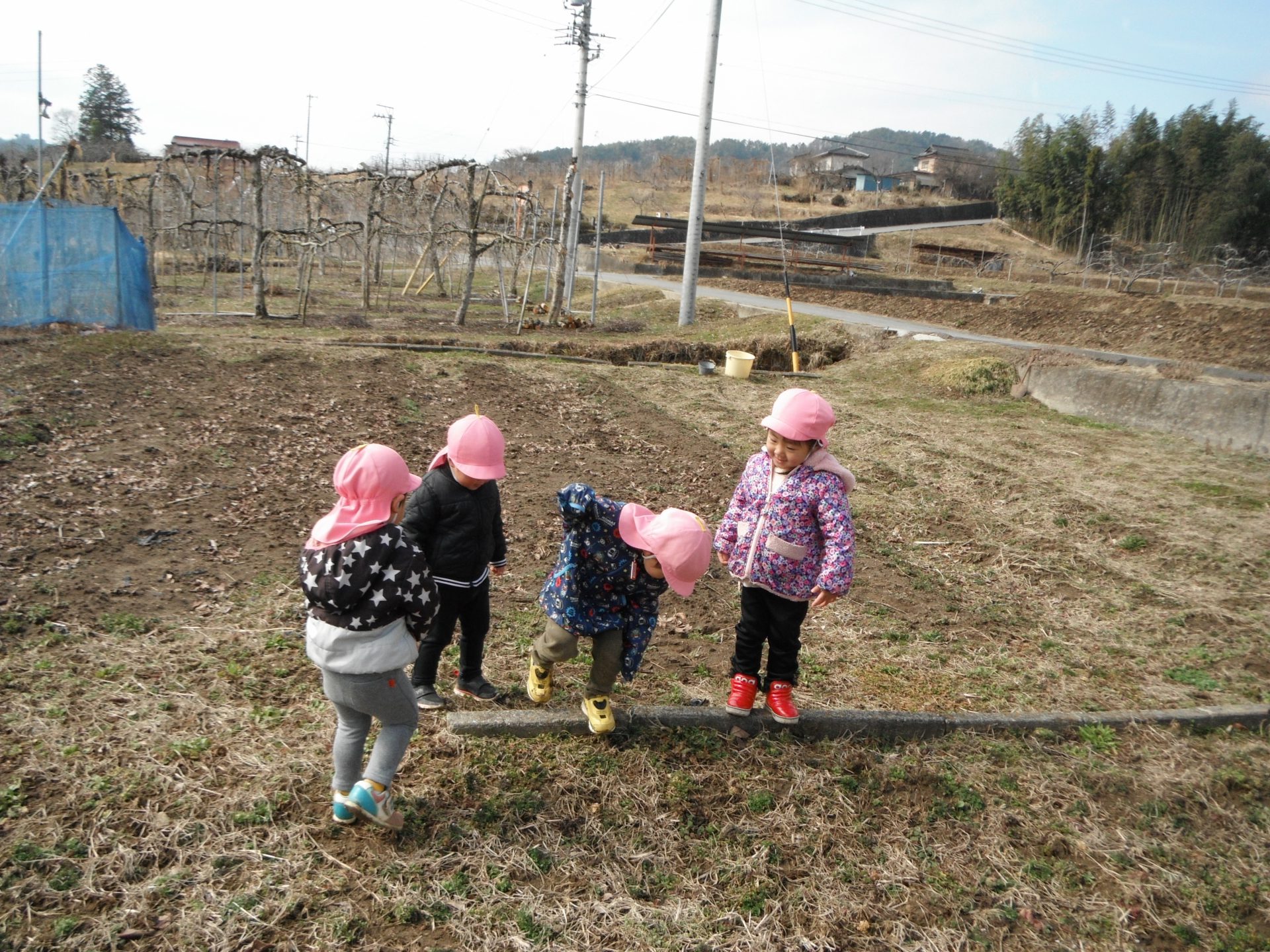草花や空のおひさまを探しながら、「先生待ってー!」と保育士や友だちを追いかけたり、ちょっとした段差からぴょんとジャンプしたりして、少し寒かった体もぽかぽかしてきました。
