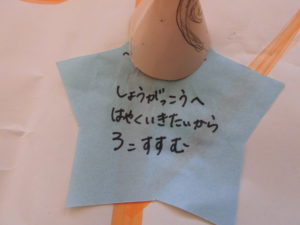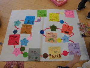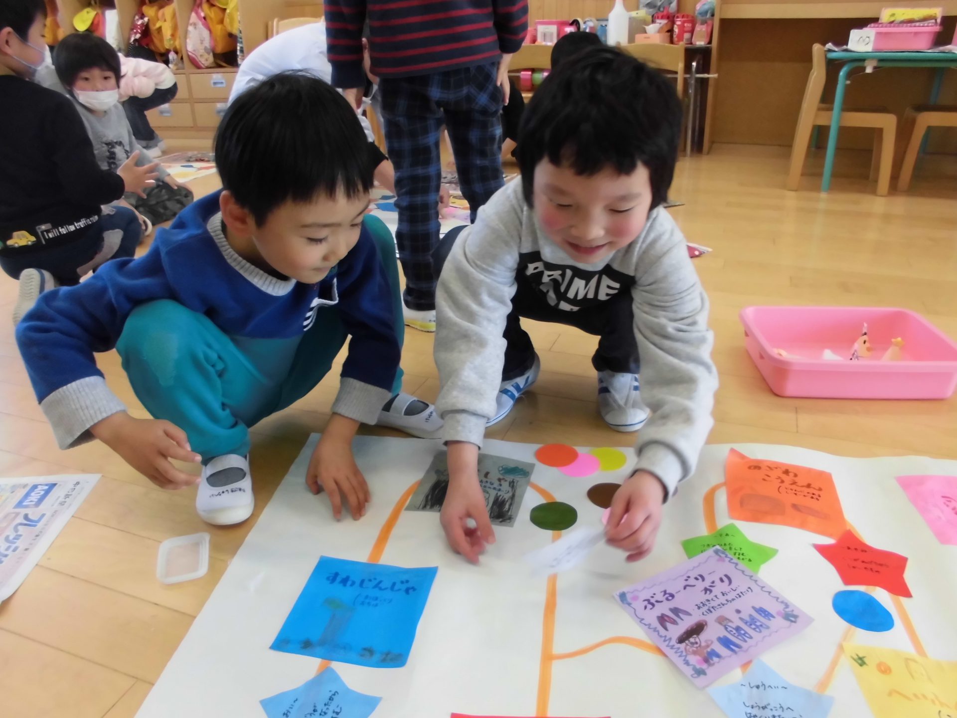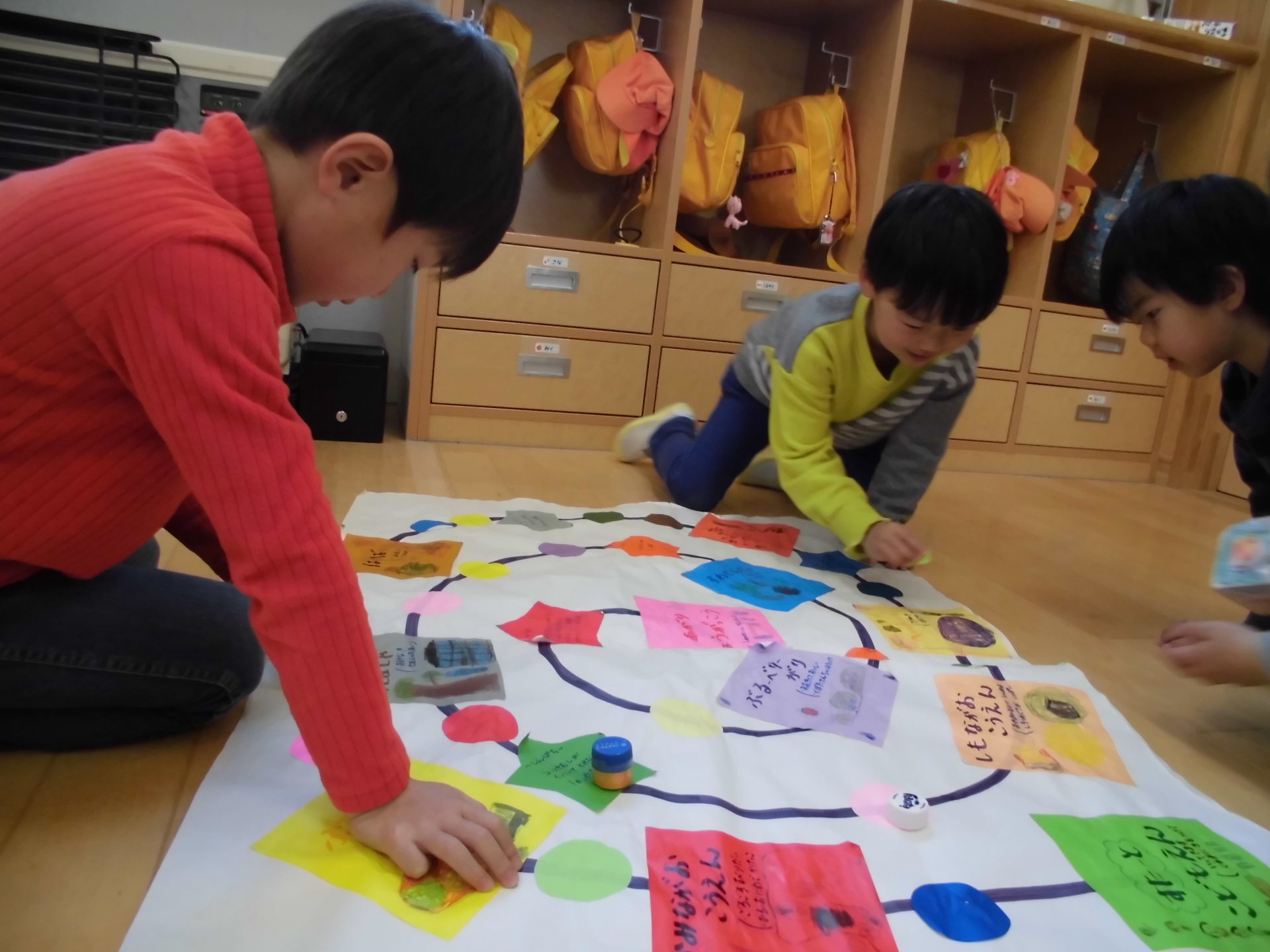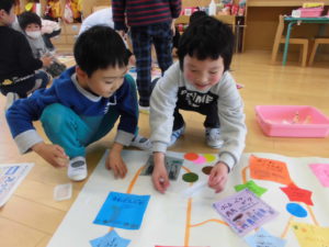 もうひとつ年長さん!1年間のお散歩を振り返って「どこへ行ったっけ」「ここも楽しかったね」とグループごと考えてお散歩すごろくを作りました。スタートは¨こども園¨あがりは¨小学校¨なんですって!!途中に「靴が脱げたから1回休み」「足をくじいて、1回休み」「小学校へ早く行きたいから3個すすむ」なんて場所も考えました。オリジナルで楽しいすごろくでした。