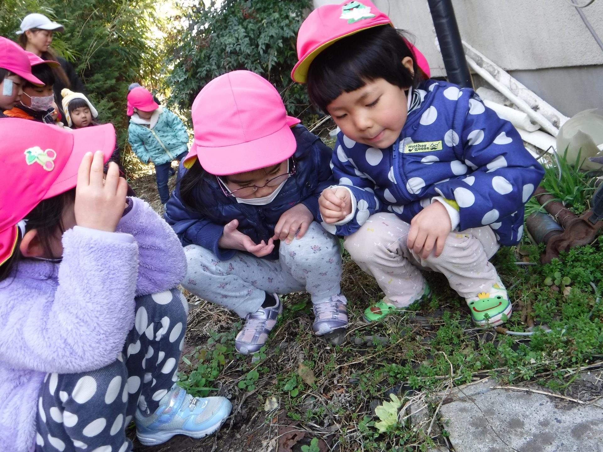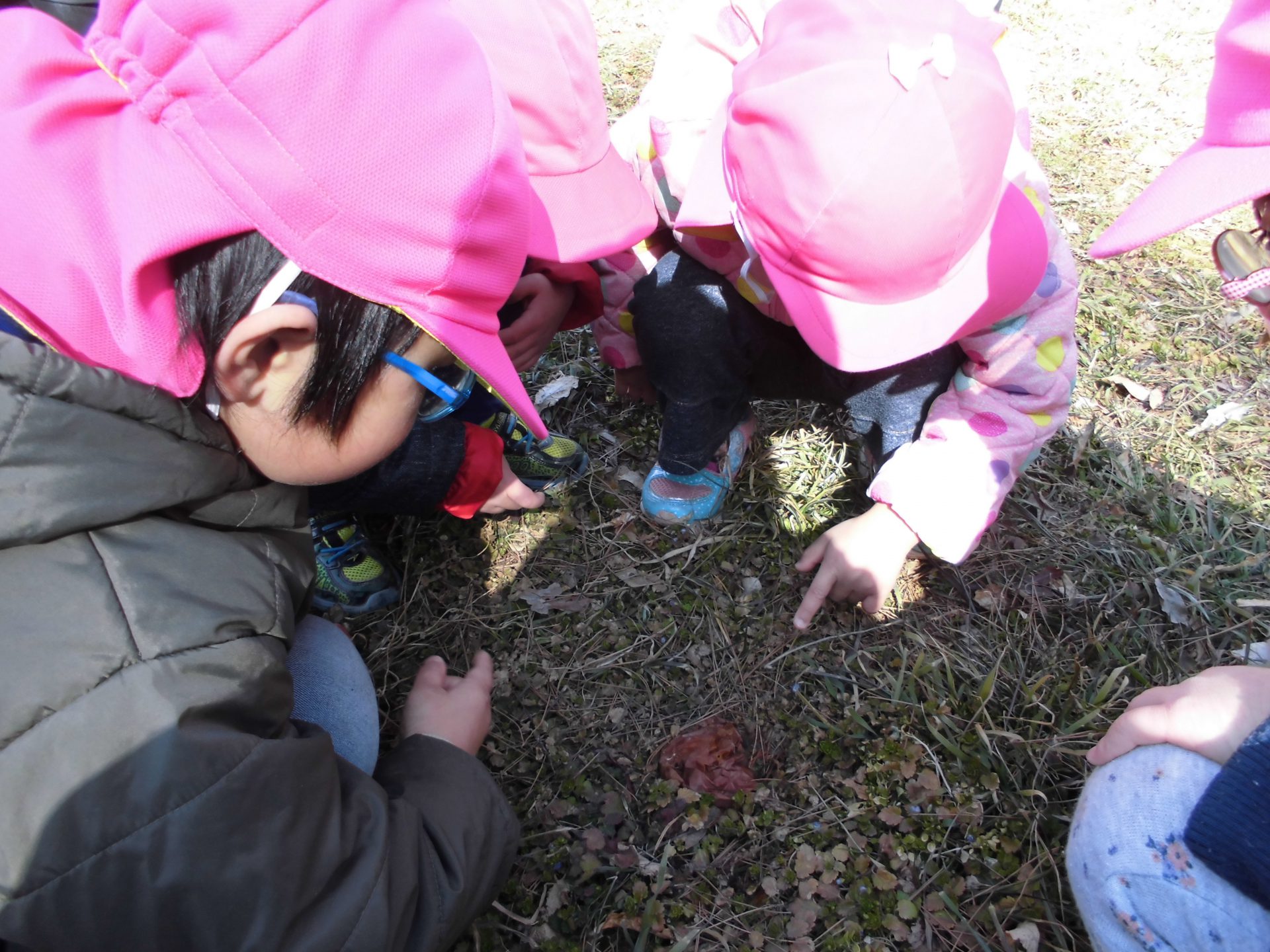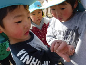 年少さんから¨トトロのトンネル¨の噂を聞いて、さっそくトトロトンネルを通って春探しに行って来ました。トンネルを抜けるとそこは春!!オオイヌノフグリやヒメオドリコソウなど春一番に咲く小さな花を摘んで「花束できたよ~」と喜ぶ女の子たち。そして、春の陽気に誘われて一番に出て来たテントウムシやダンゴムシ・・・「見せて」「さわらせて」と大人気でした。