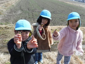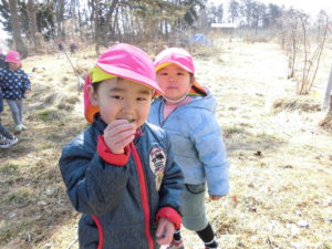 お散歩中、何かを見つけました。「大変、こんなところに梅干しが落っこちてる」「うわぁ!すごいでかいじゃん」「どれどれ」とあっという間に子たちが集まりました。「こんなところにまさか・・・?」と保育士も見に行くと、本当に梅干しそっくりでびっくり!!よく考えるとそこはリンゴ畑の真ん中、秋に落ちたリンゴがそのまま冬を越し、梅干しそっくりの形状になってしまったのです。こども達は面白いものを見つける神様です。