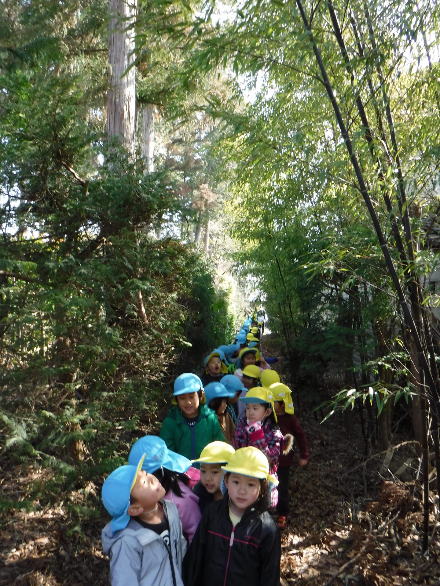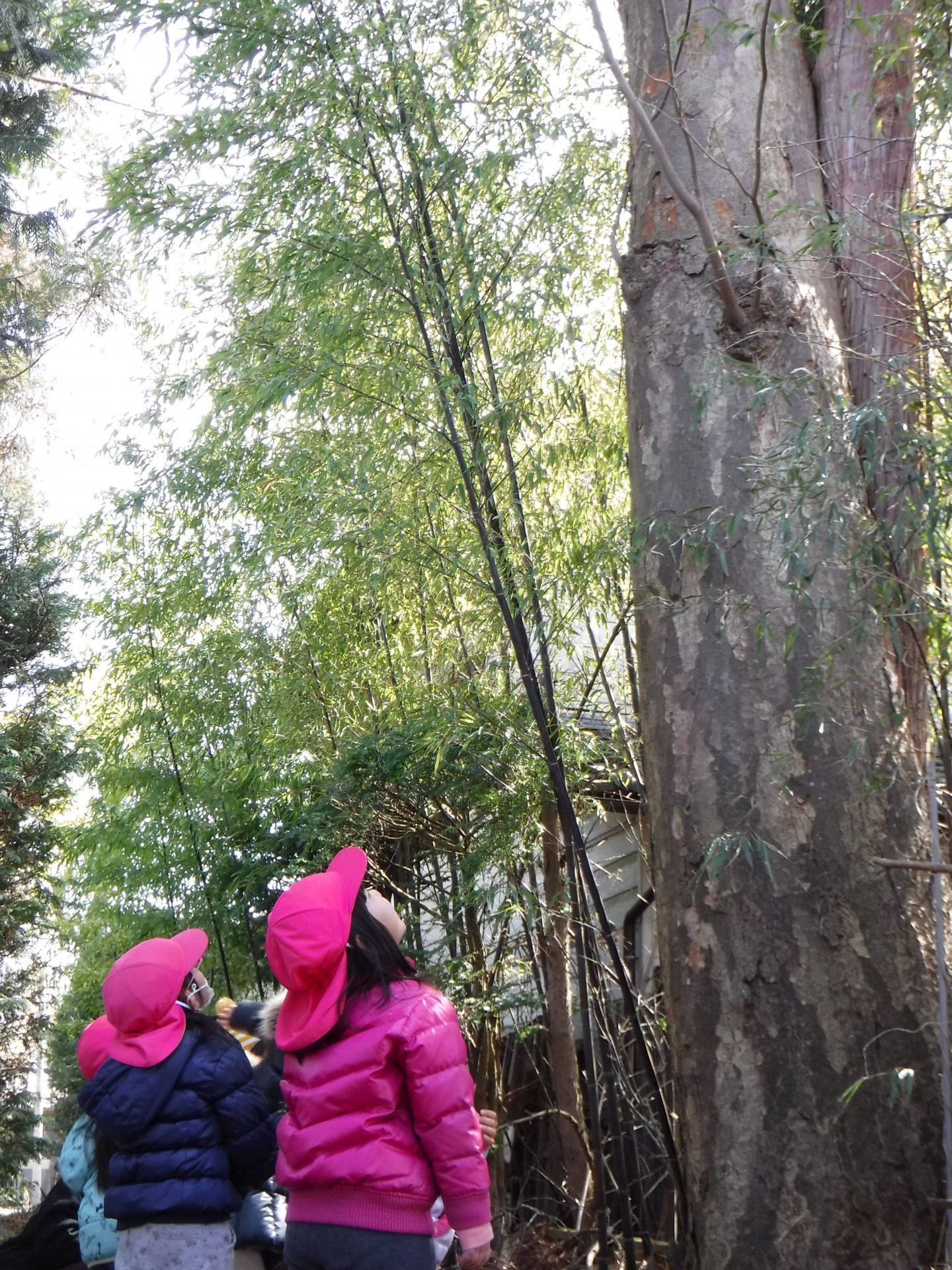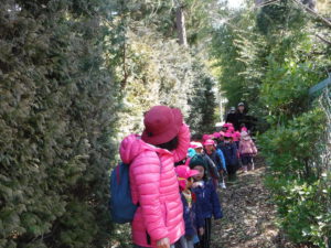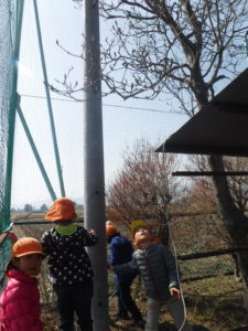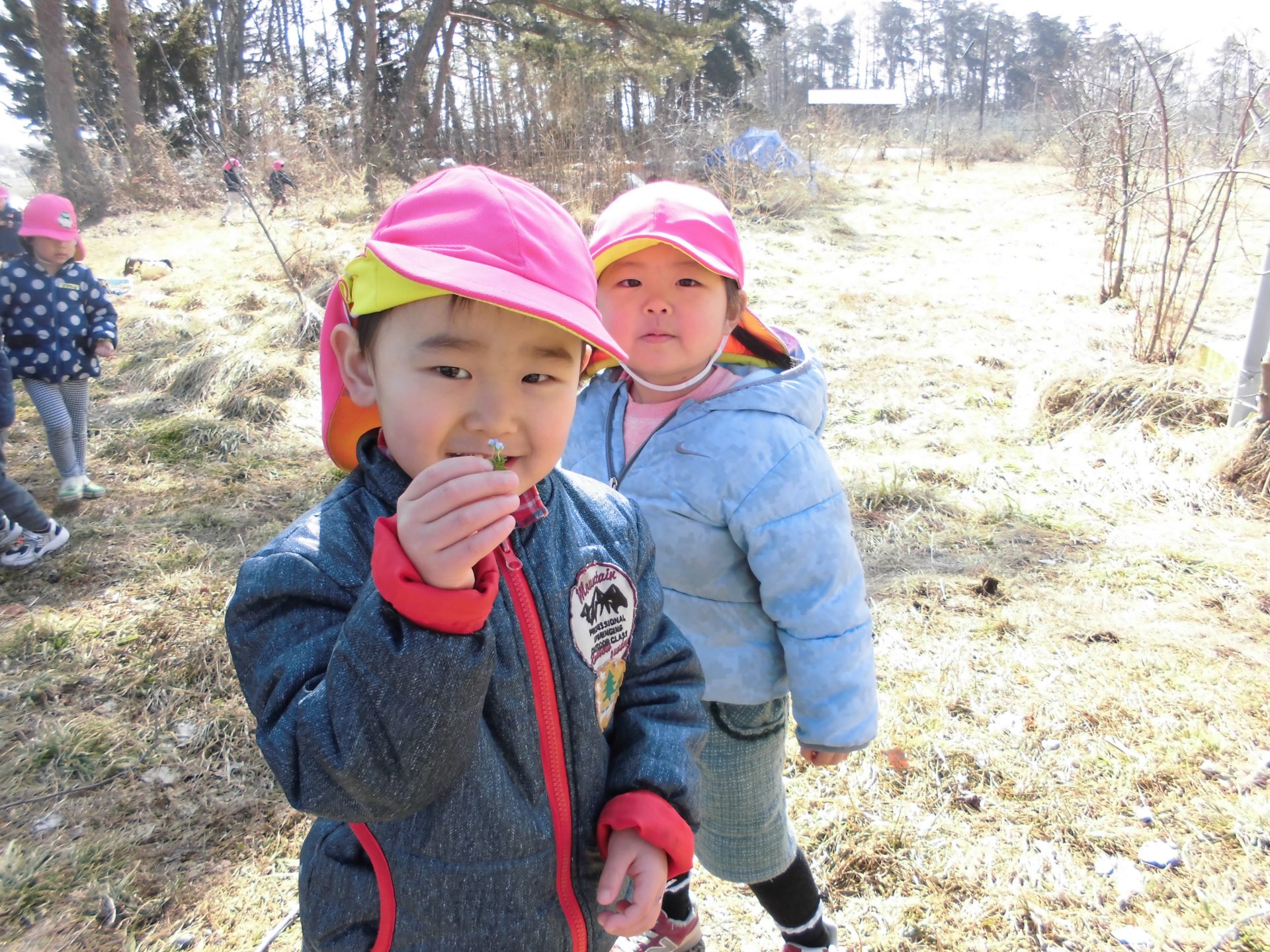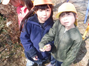【年長さん】 もうすぐ卒園・・・こども園の思い出に、春探しのお散歩に行ってきました。さっそく¨春探しゲーム¨です。さすが年長さん!高ーい木の上の新芽も見つけられました。そして、今から旬を迎えるふきのとうも見つけました。子ども達も嬉しそうです。春っていいですね!!