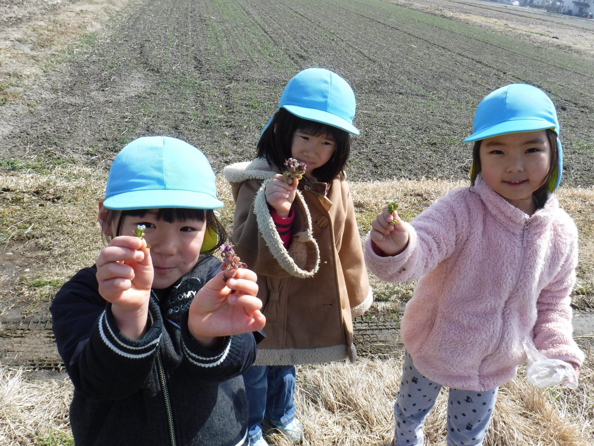 クラスの思い出づくりに、それぞれ散歩に出かけました。年長さんは、こども園最後の思い出に、今までお散歩に出かけた場所に春を探しに出かけることにしました。「春見つけられた?」という保育士の問いに、年少さんや年中さんが「オオイヌノフグリ」「ヒメオドリコソウ」というちょっと難しい名前の花を知っていたり、高い木の上の新芽を見つけたり、何よりも「これから花が咲くから」「芝に寝ころべるから」と目には見えないけれど春を感触や心で感じられるようになったことに子ども達が心も体も成長しているんだなととてもうれしく思いました。そして、そんな心を育ててくれている安曇野の自然に感謝いっぱいです。お天気の良い日にはお子さんと春探しに出かけてみてください!!きっと、大人では見つけられない面白い発見があると思います。
