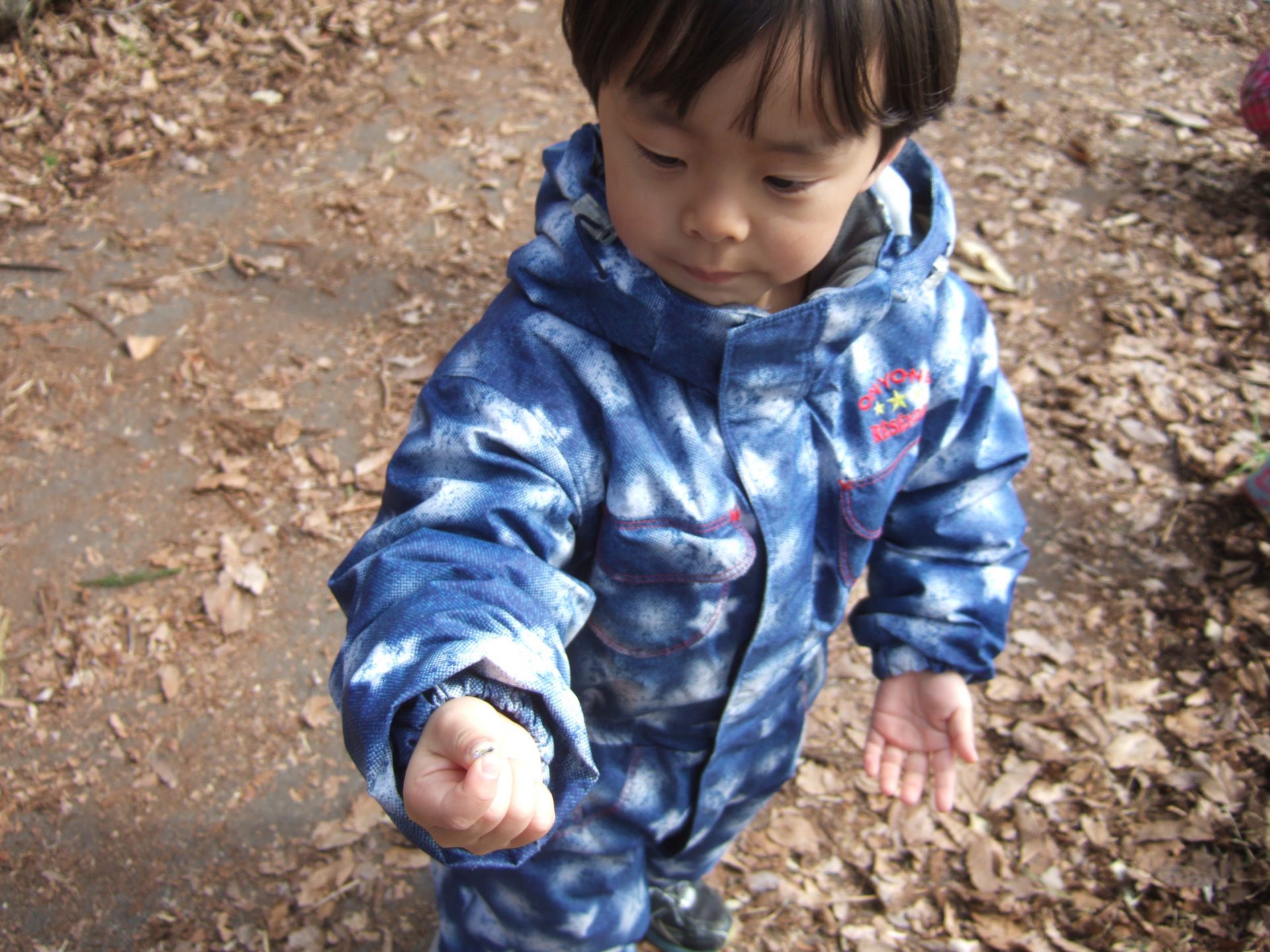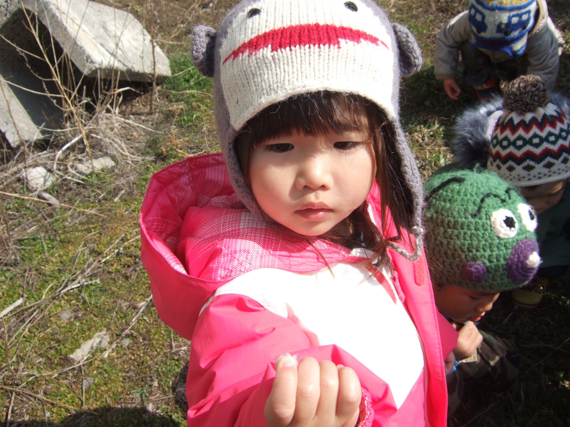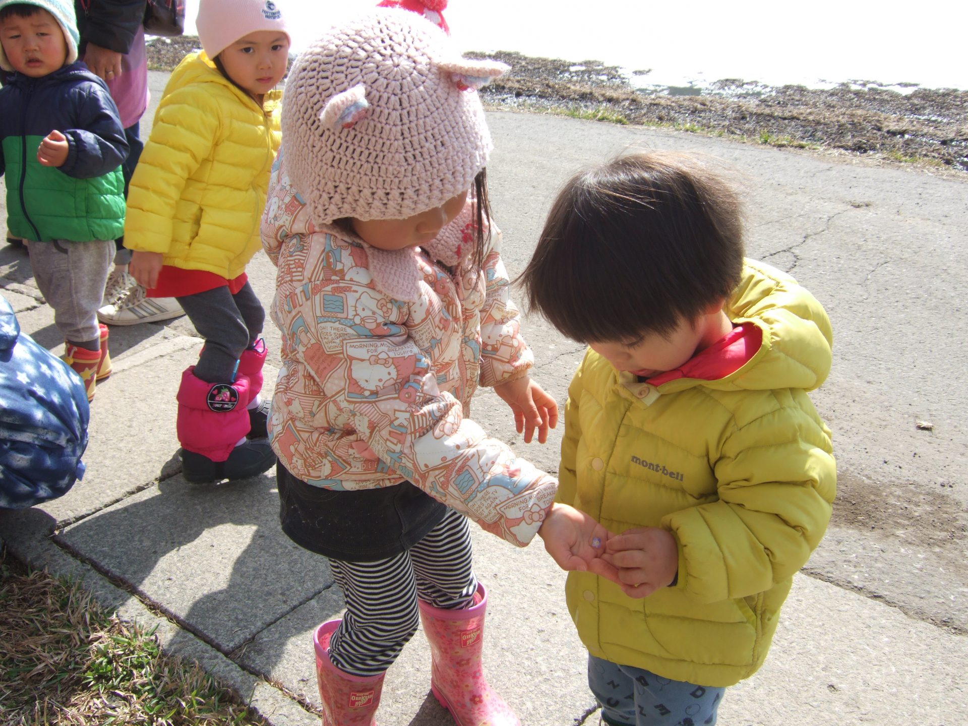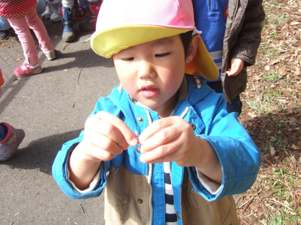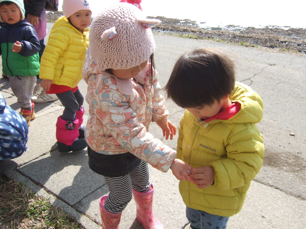 2歳児のお姉さんが1歳児さんに優しく見せてくれたり手に握らせてくれたりしました。