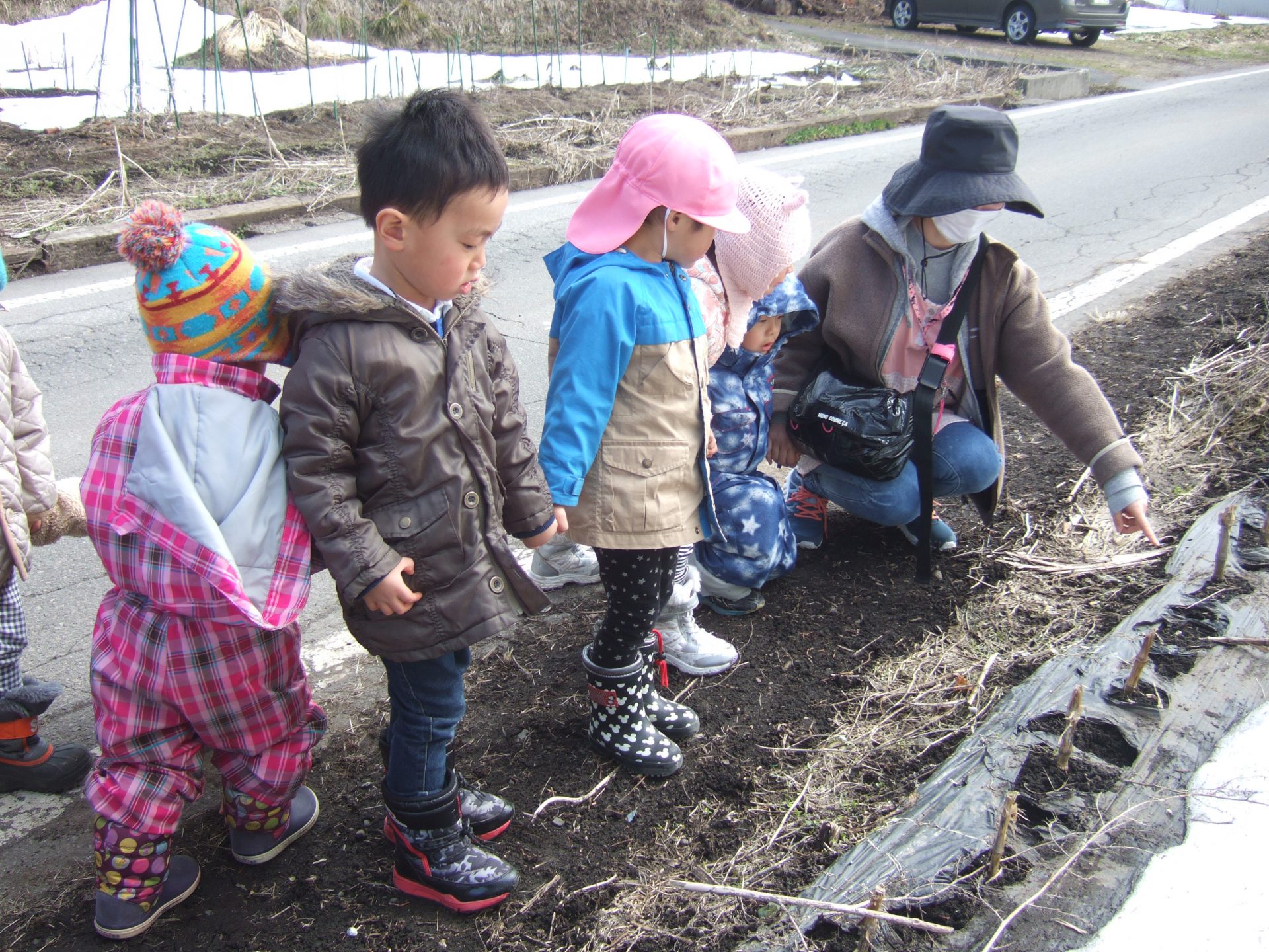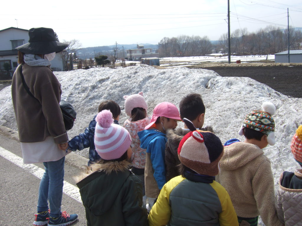 田んぼにある雪が真っ白ではないことに気がついた子ども達。