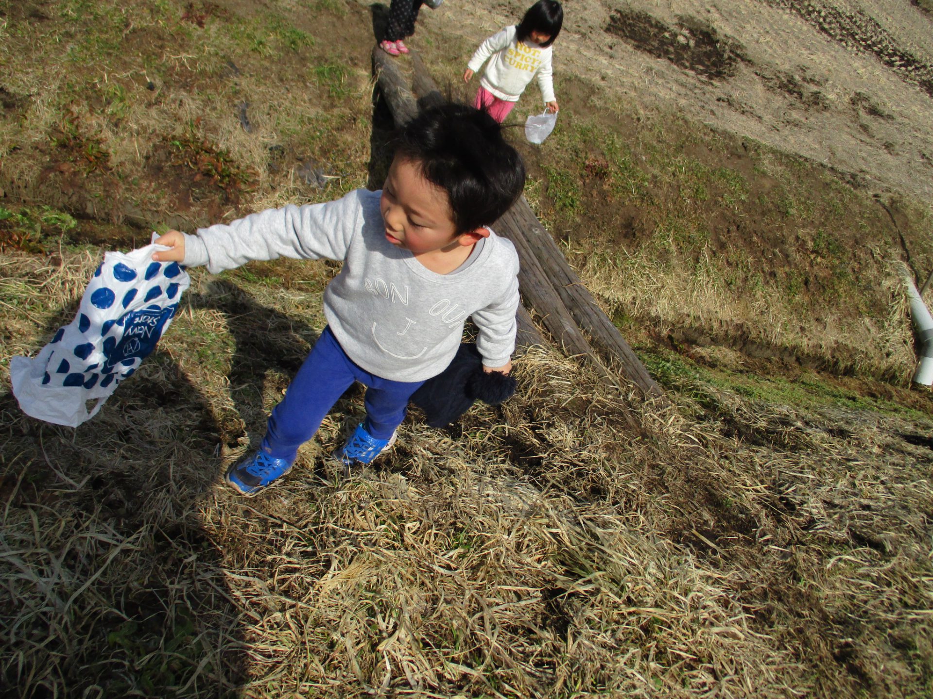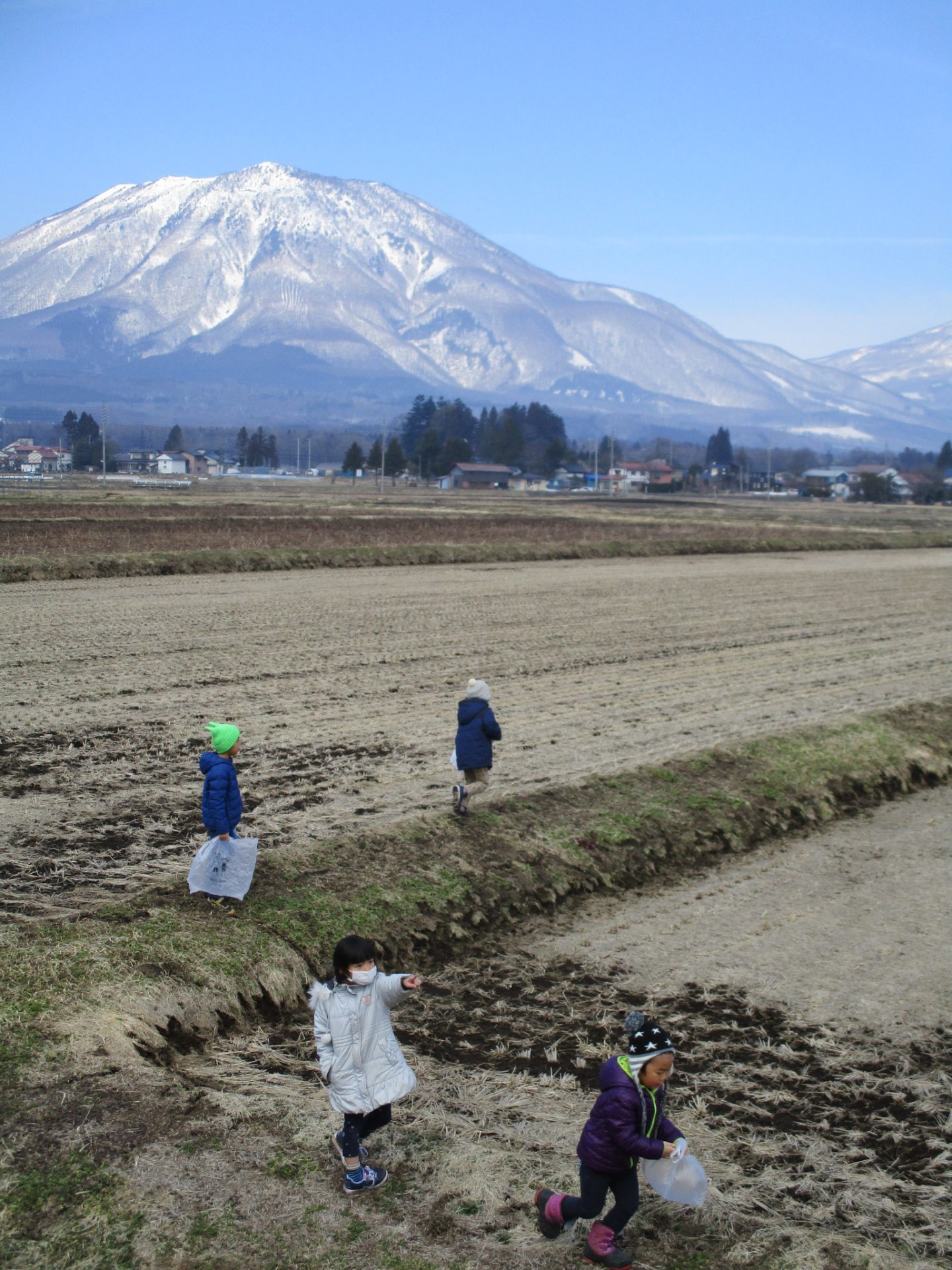 積もっていた雪も暖かさですっかりなくなり、3〜5才児で園の隣にある農道へお散歩へ行きました。
