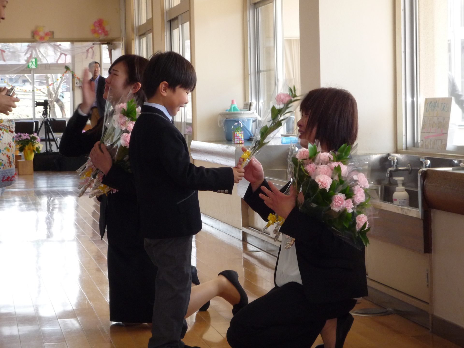 涙が止まることはありませんが花を手渡し、思い出の園舎を大好きな在園児・保育士に見送られ巣立っていきました。