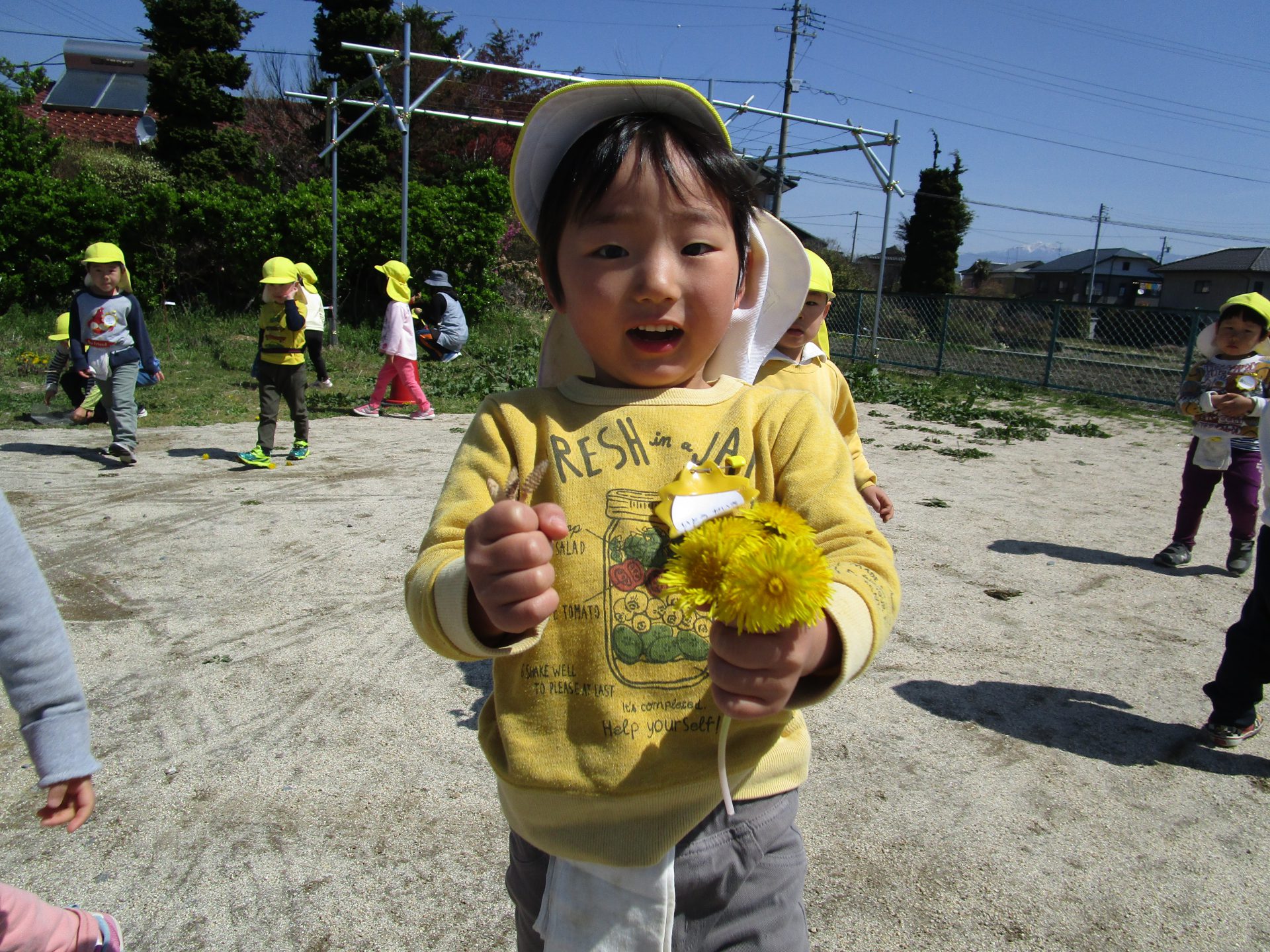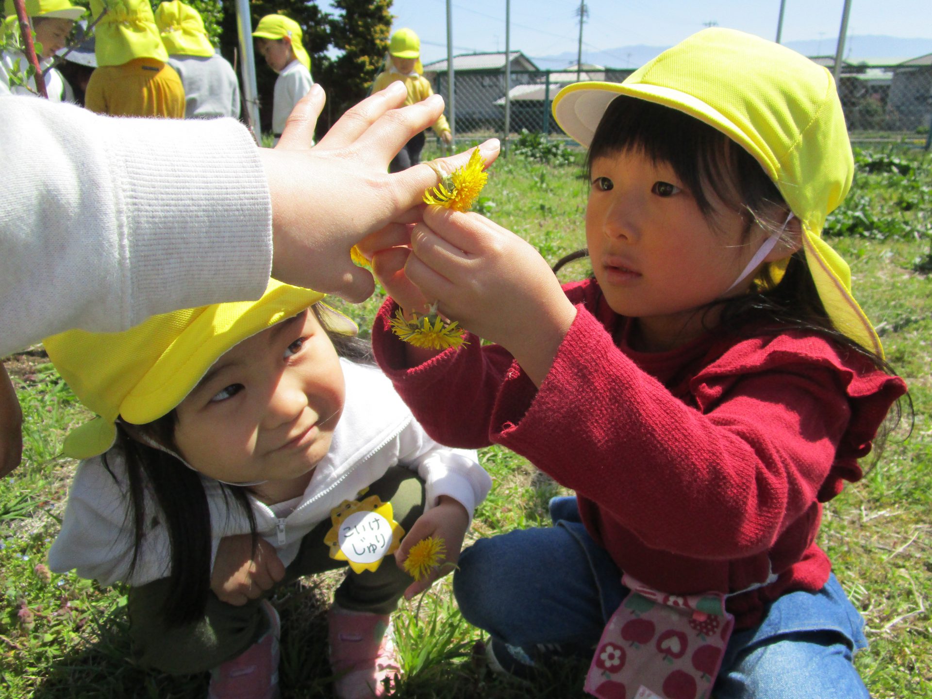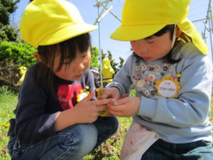 ・暖かい日差しの中、新年度が始まって初めての散歩に出かけた4歳児。虫探しや草花あそび、花摘み…と、身近な植物や虫と触れ合う中で、一人ひとりの遊びが友達に広がって、一緒に楽しむ姿があった。