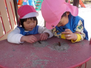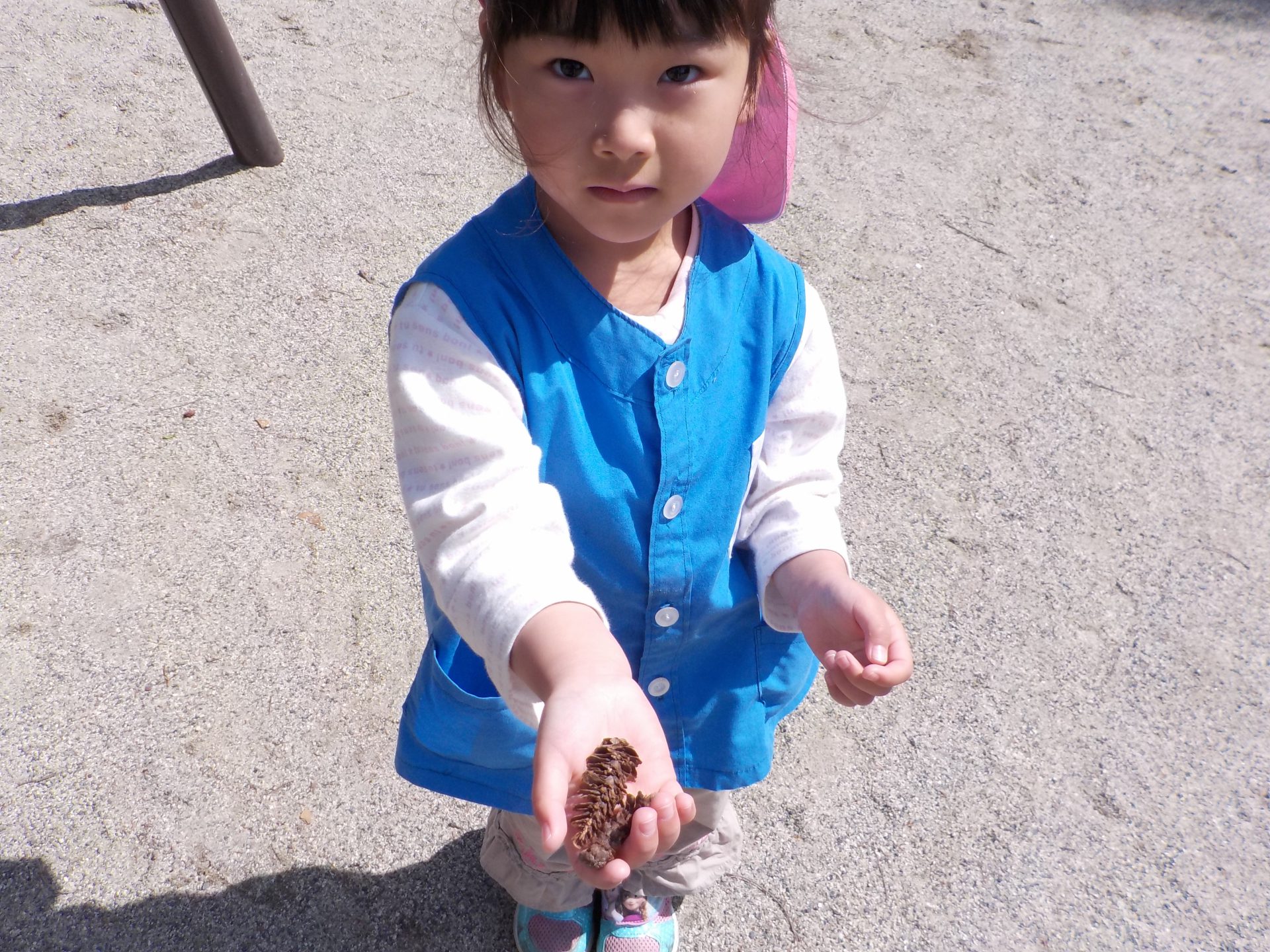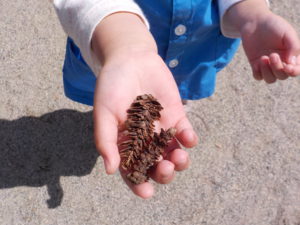 松ぼっくりの芯でしょうか?子どもの目線から見ると何でもないことでも感動の発見です