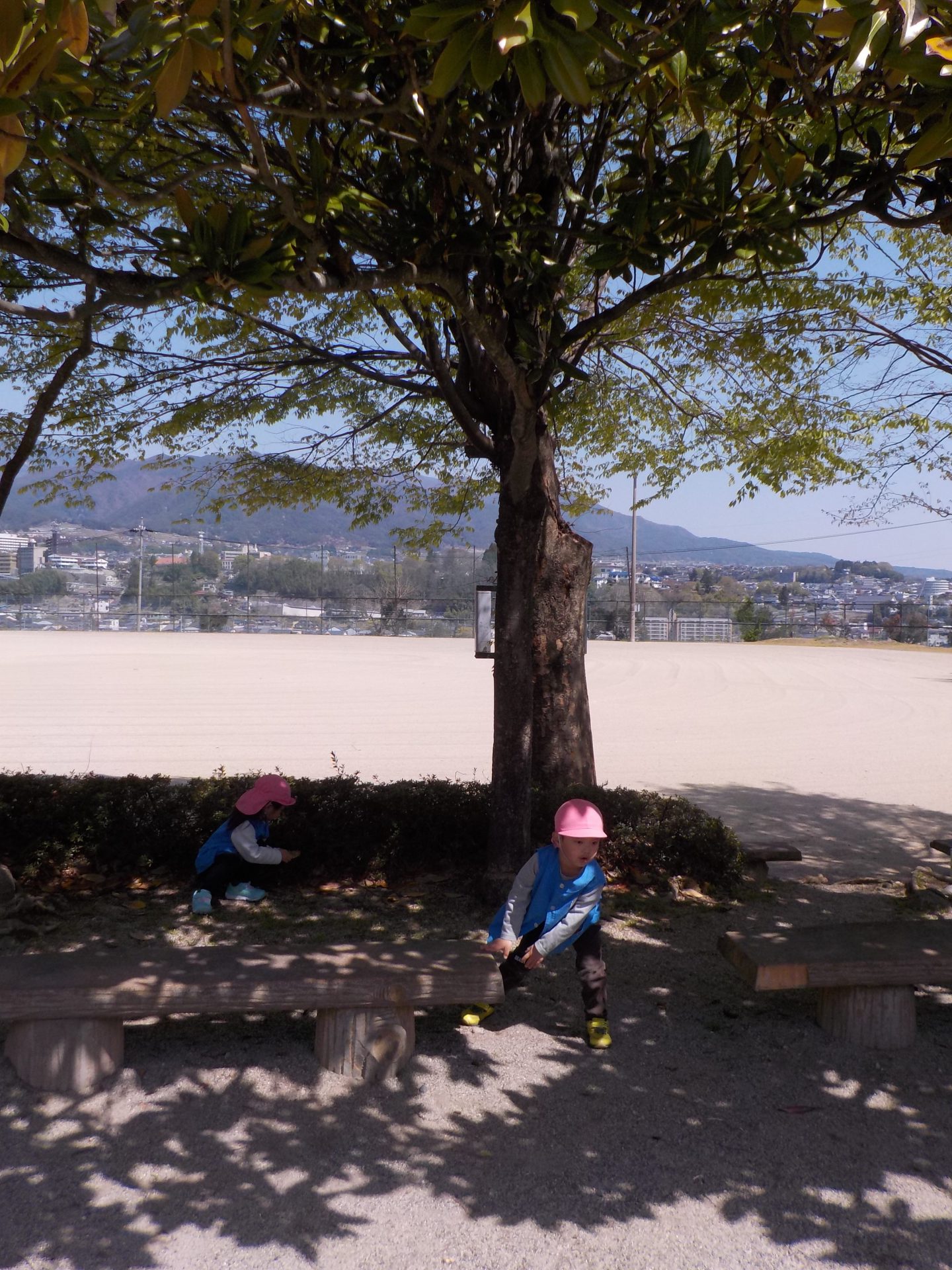 戸外で遊ぶ中で春の自然を感じてほしいと思っていましたが日差しを感じたり自然物を自分たちで見つけ、不思議に思ったり、触れてみたりすることができました。