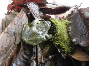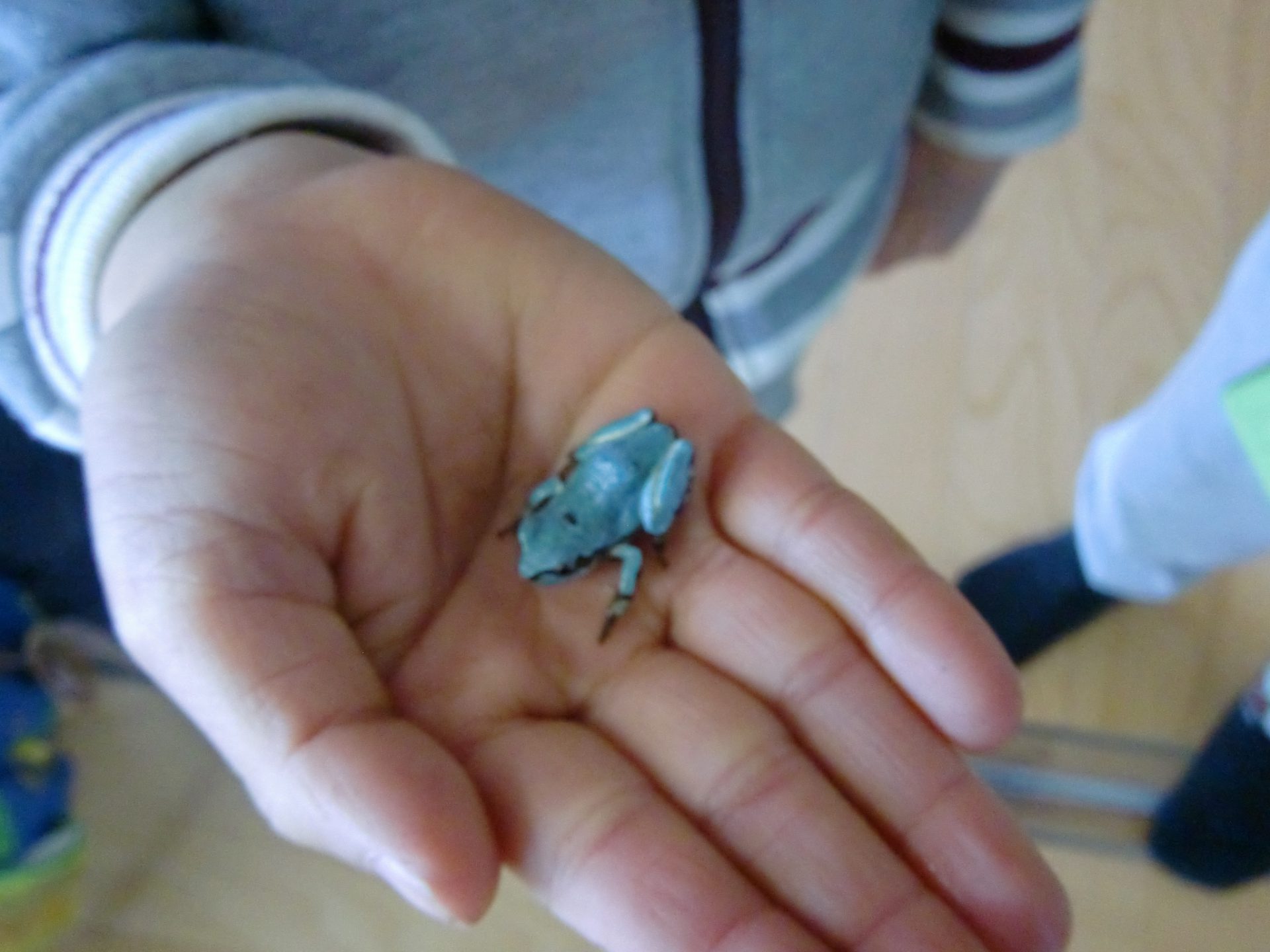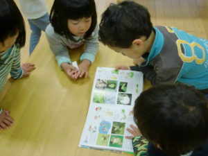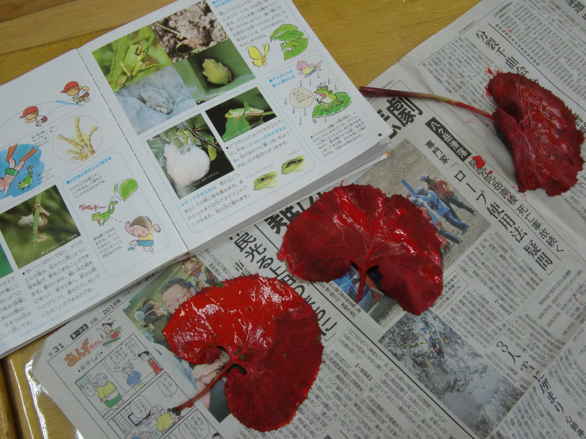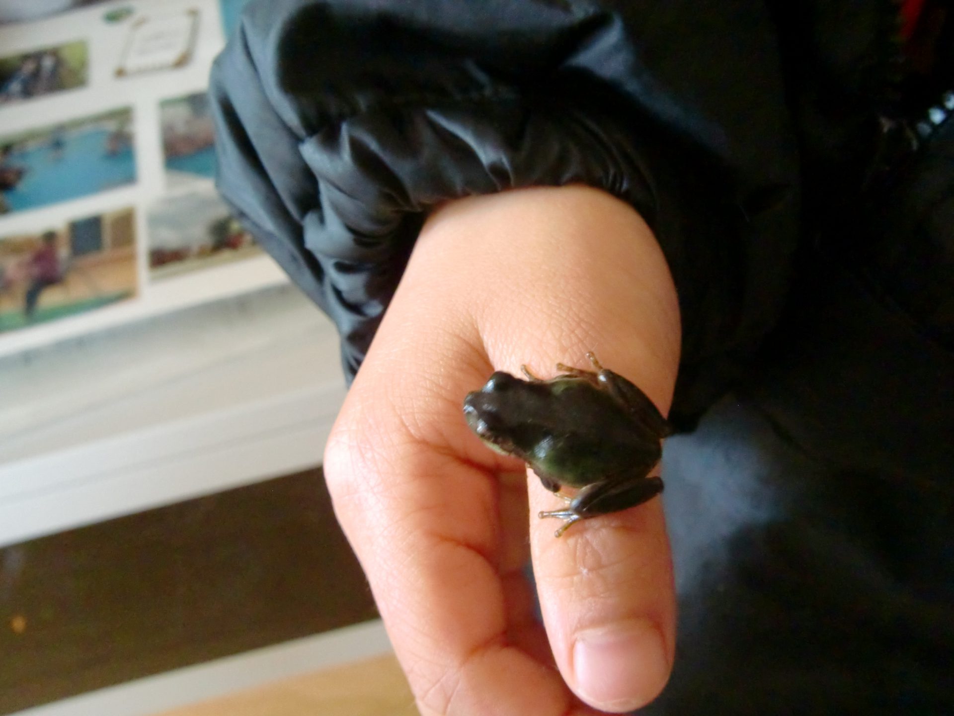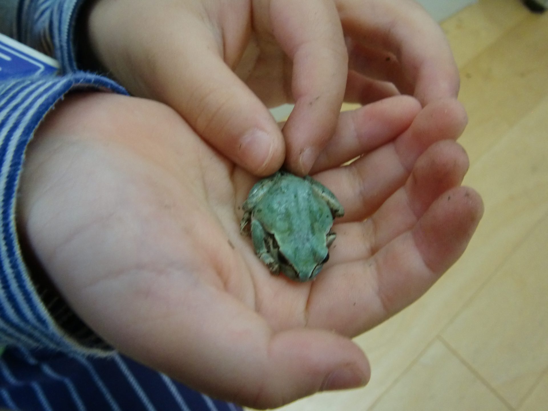 落ち葉の中から見つけた黒いカエルが、緑に変身したことを不思議に感じた年長さん。