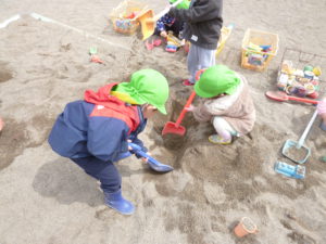 「砂の下から水がしみ出すまで掘るんだ!」と張り切って掘っています。