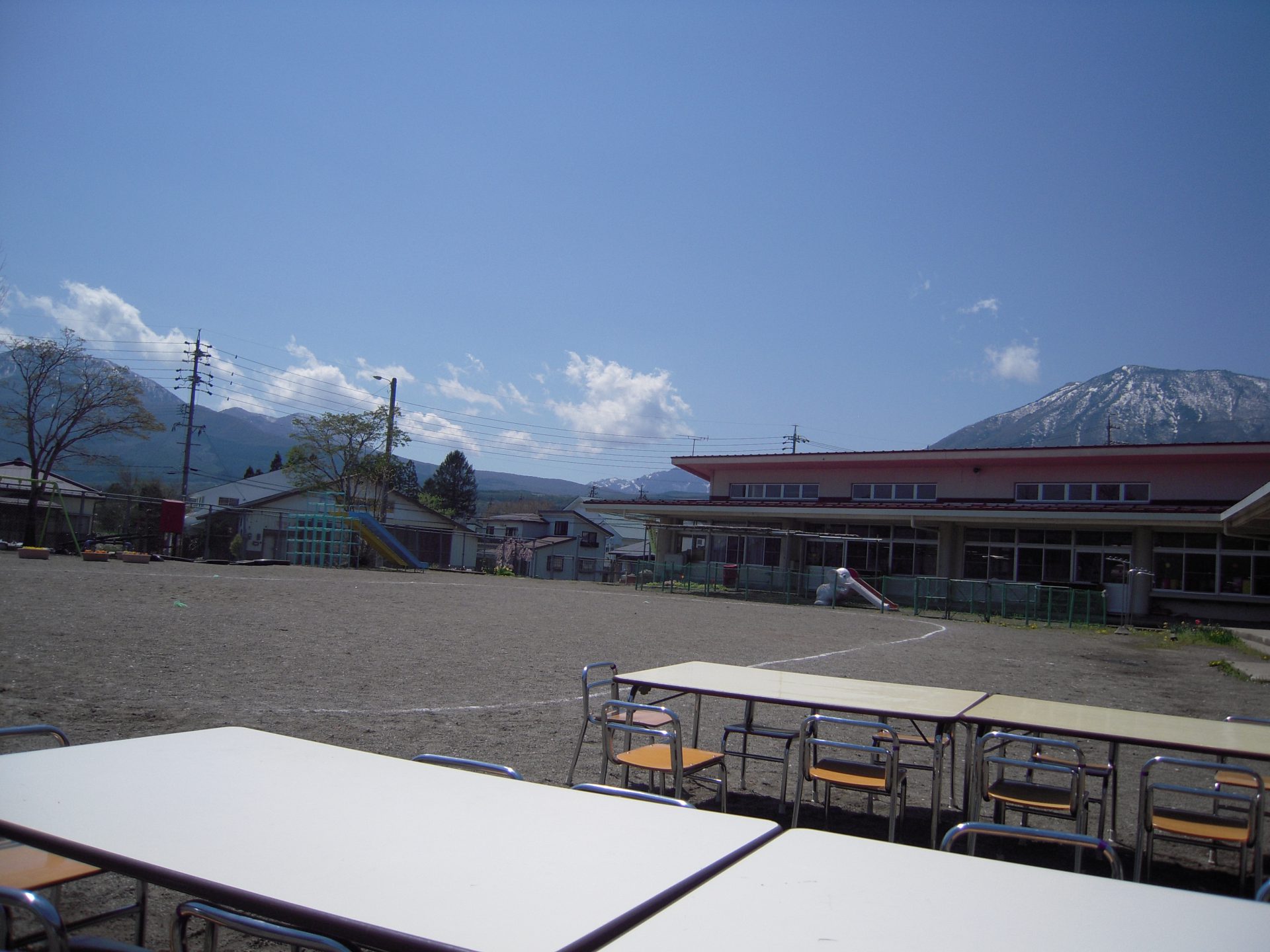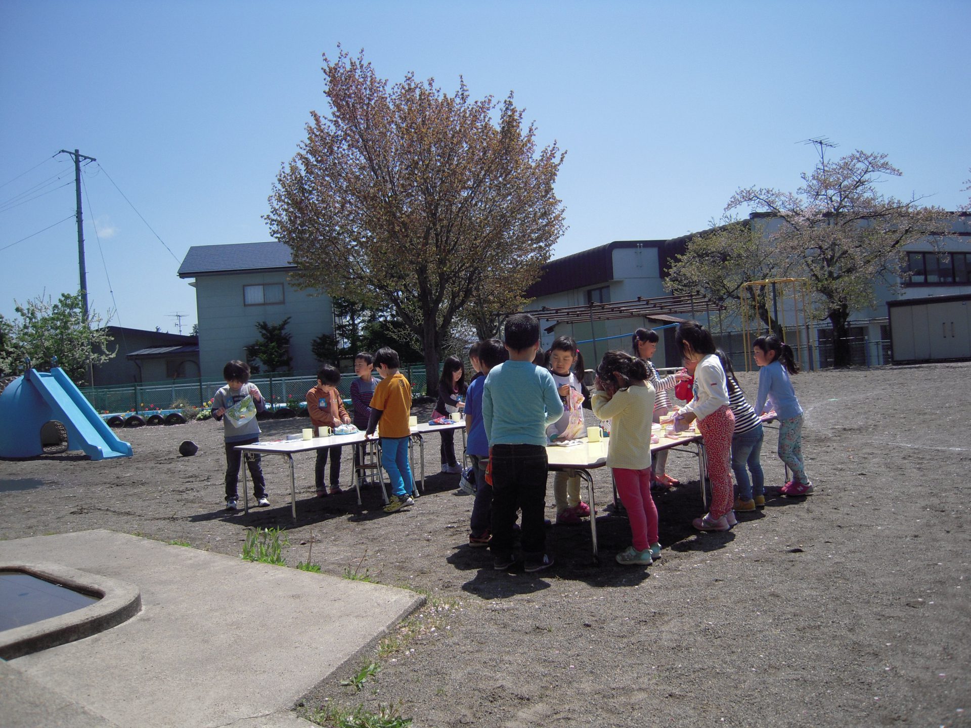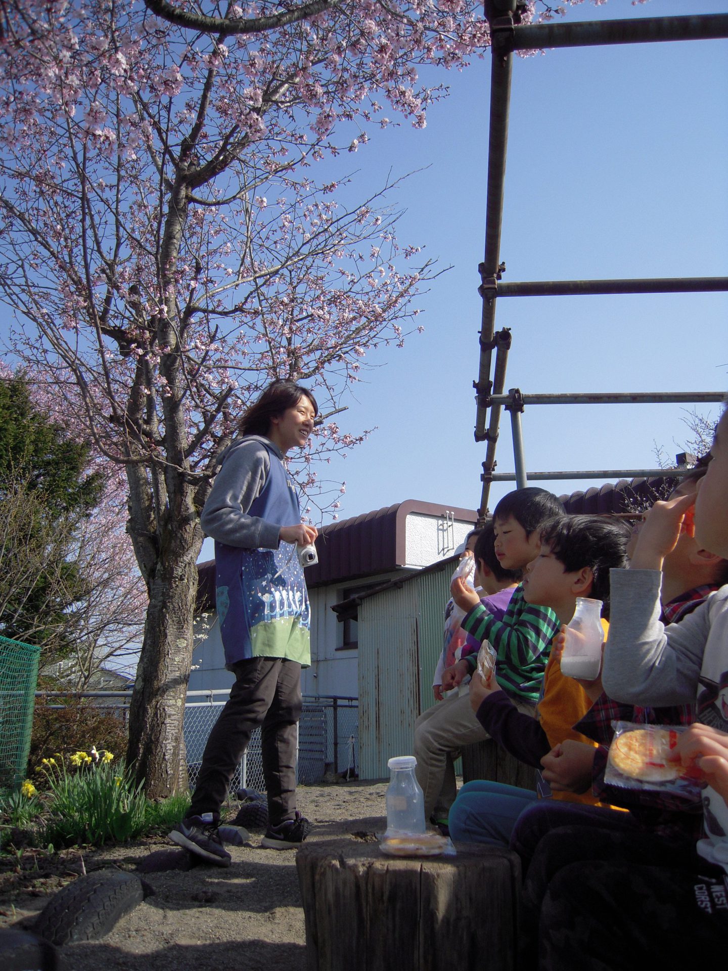 桜はもう散ってしまっていたのですが、よく晴れたこの日、園庭に登場したのが、
