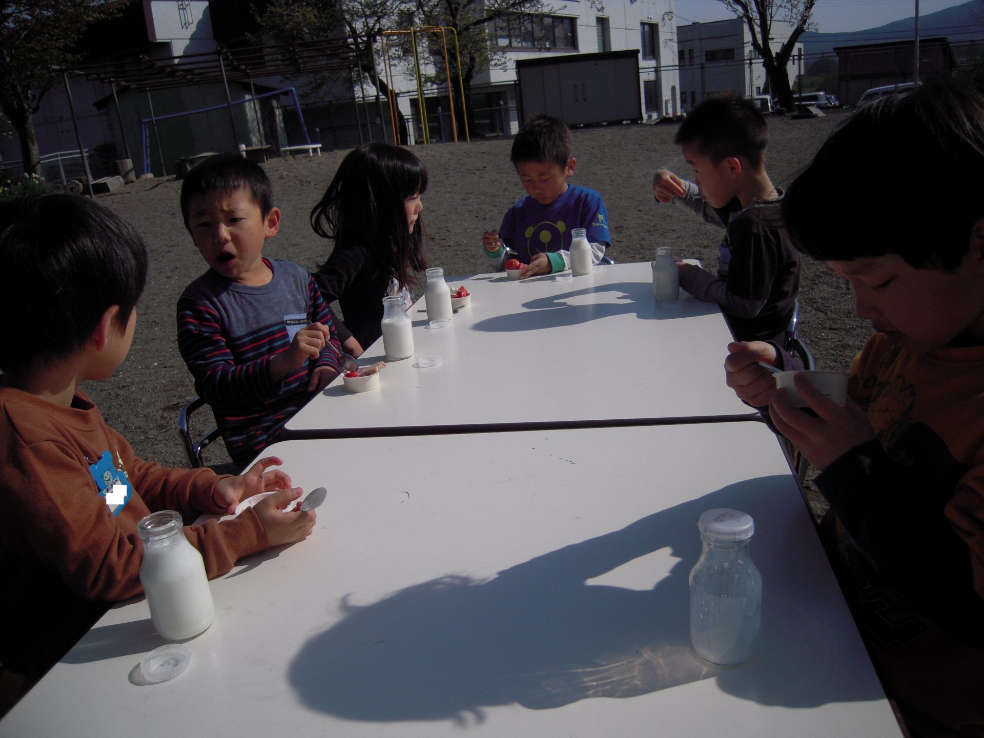 とっても天気がよく気持ちの良いお昼寝明けの午後、ふと廊下に出ると、おやつを持って次々と外へ出て行く年長さんの姿が!