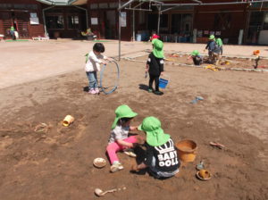 まわりでヨモギ染めをしていても全く関心なし。この子達は泥んこに夢中です。そのうちに「面白そう。やってみたいな」と来るのを待っています。雨上がり、泥んこ遊びの方が魅力的かな。