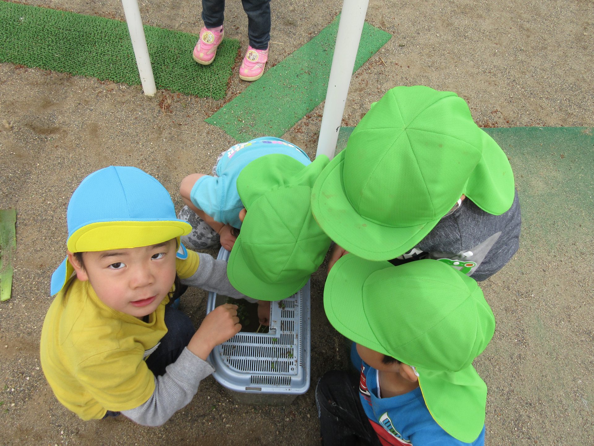 こちらではカエルに夢中。「花より楽しいよ。でも大きなカエルをさがしたいね」春はいろんな遊びが展開されます。