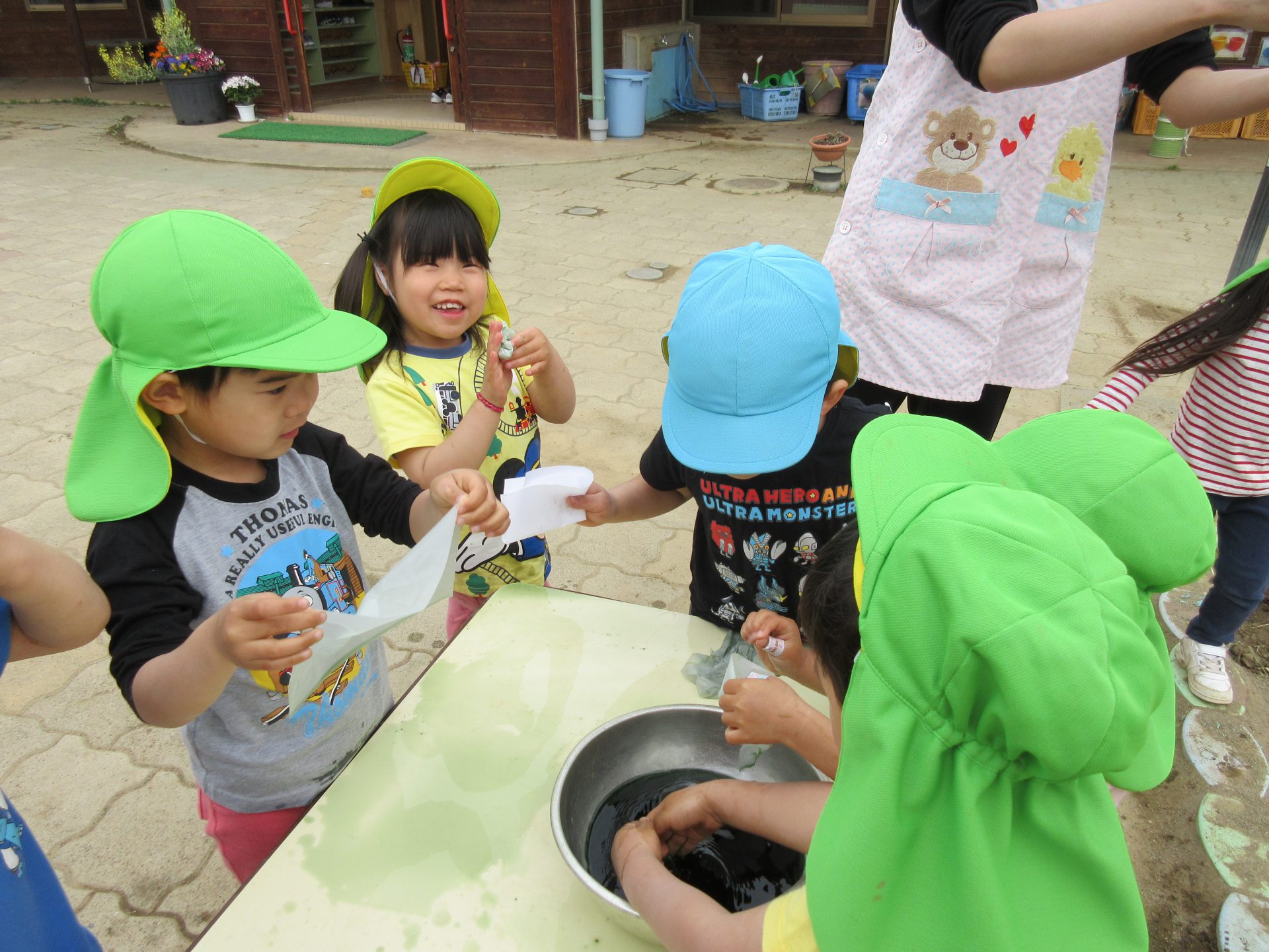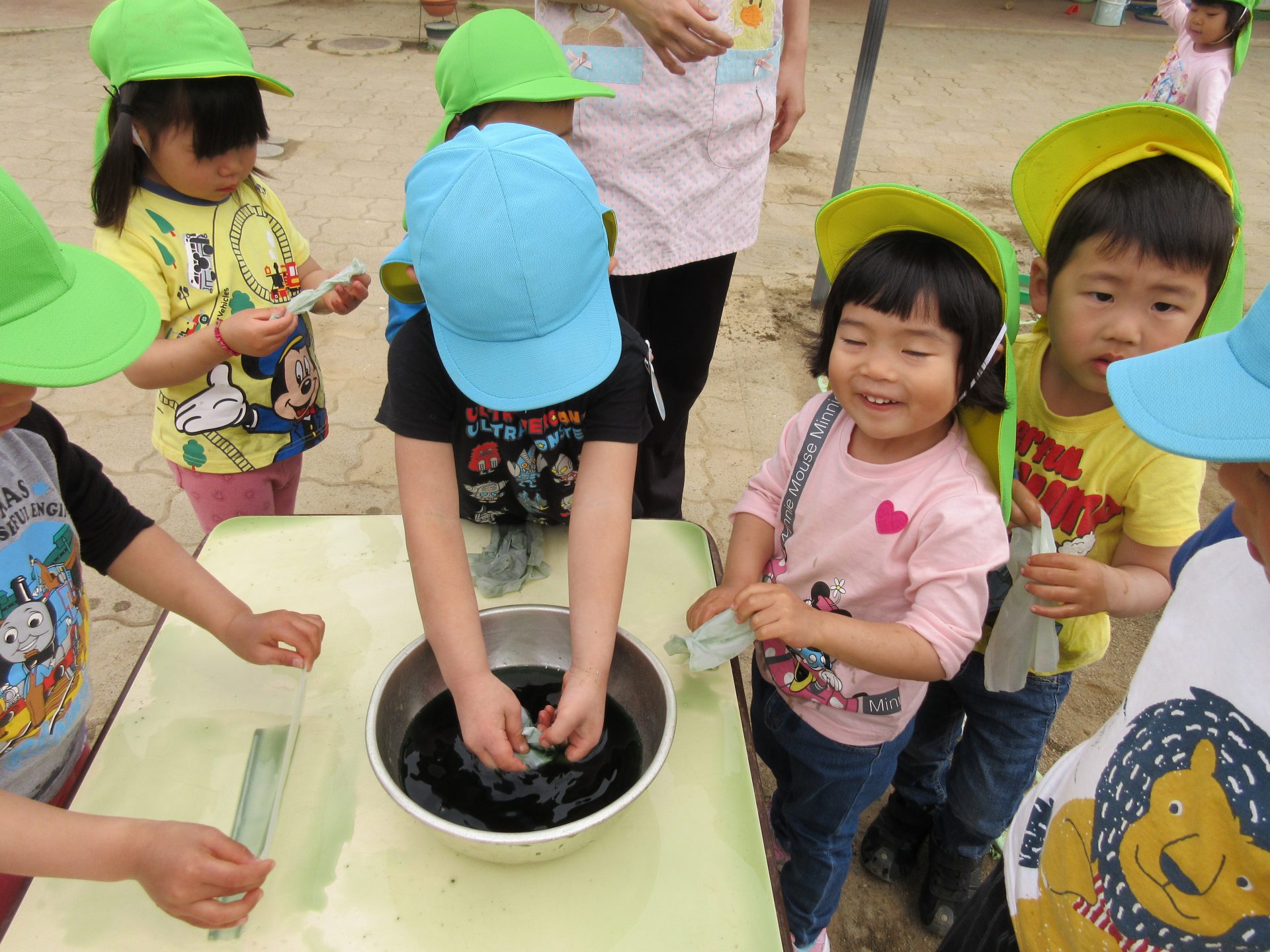 ヨモギ団子を作るのでリンゴの丘公園までみんなで行きました。たくさん摘んだので余った分はヨモギ染めに使います。ボールの中を覗いてみて「すごい色だ!」「なんか匂いするね」「草の匂いだね」ヨモギの良い香りがします。色が濃いので手を入れるのに慎重な子もいますが、和紙を何枚も染めて楽しみました。
