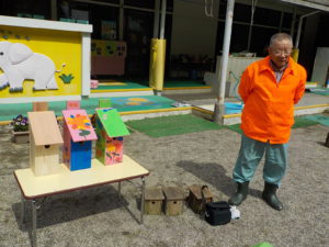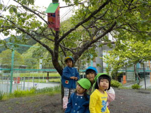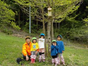 巣箱を付けている時にエサをくわえた小鳥が近くに寄って来て大喜びの子ども達でした。「来た来た!巣箱に入ってくれるかな・・」「赤ちゃんがいるのかな?エサをくわえている!」