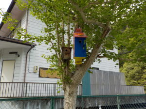 宮澤さんが持って来てくれた巣箱も一緒に付けて、アパートみたいにしてみました。「小鳥さんがたくさん来てくれるといいな・・」