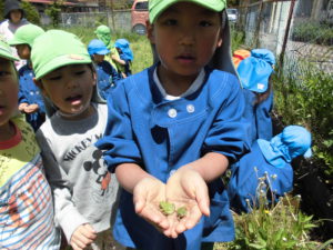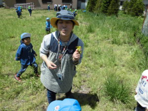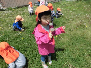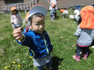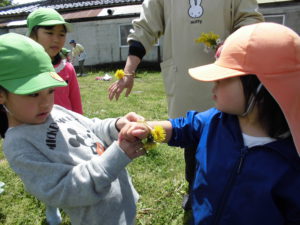 異年齢の関わりがあちこちでみられ、みんなの心が自然と和んだように感じられました。5歳児が保育士にたんぽぽ時計を作ってくれたのを見た2歳児の「ほしい」という言葉を聞いて、2歳児にたんぽぽ時計を作ってあげている姿を見て、言葉では表しずらいけれどあったかい気持ちになりました。穏やかでとても幸せを感じました。こんな時間を保育園でたくさん子どもたちと共有していきたいと思います。